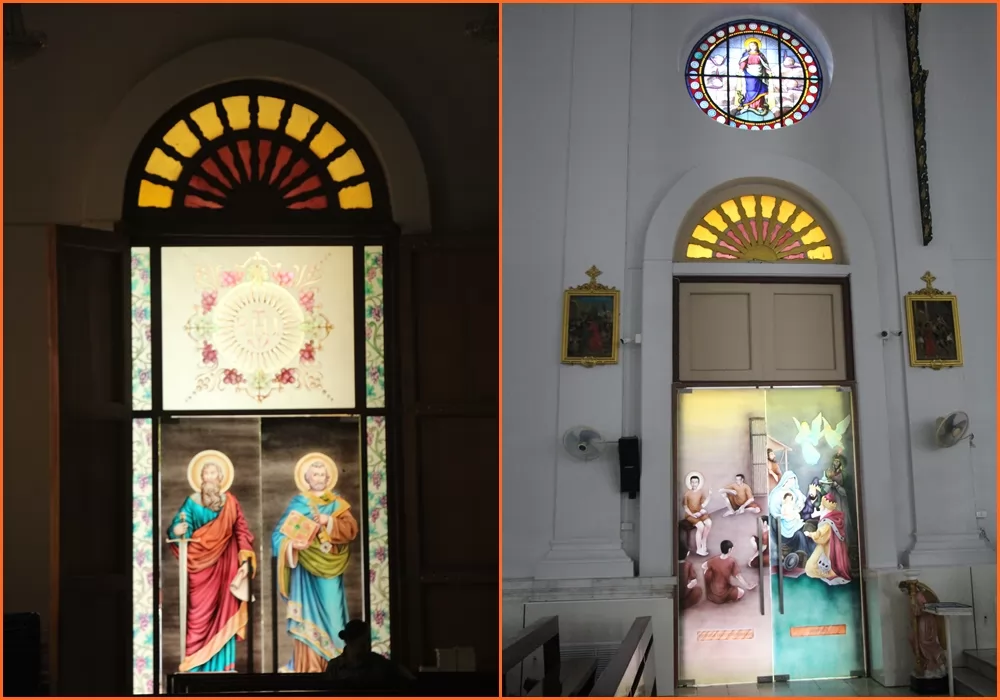 教堂裡面白色牆壁,使用彩色玻璃來裝飾圓窗和門上的天主教人物,在光線穿透下顯得明亮而立體,讓前來禮拜或是參觀的遊客感覺舒適和放鬆。