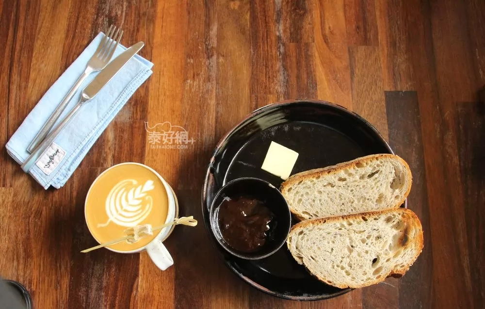 屋裡面整體色調都淡淡的黃色,環境優雅舒適,裝飾風格簡潔時尚,值得來這裡吃點心甜品、喝杯蜂蜜拿鐵(120銖),休息一下。