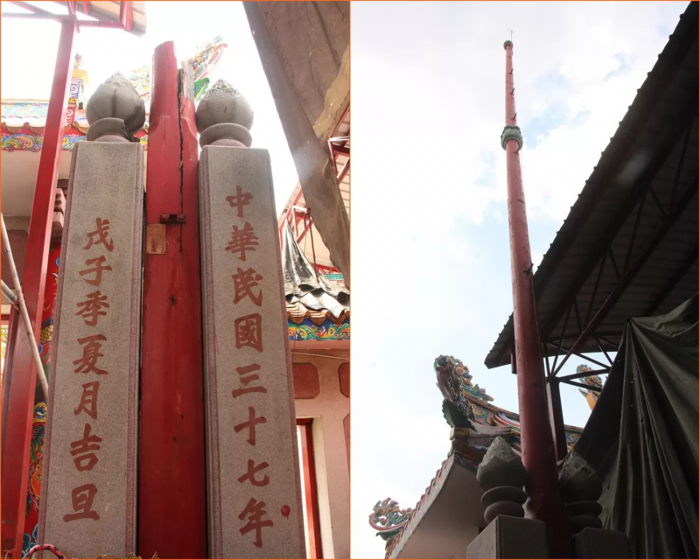 這座寺廟不知何時所建,可考證的時間只有民國37年豎立起的兩根很高的木杆(1根已毀),另外內堂供桌上點燃眾多又紅又粗的香蠋,是難得一見的奇景。