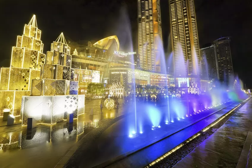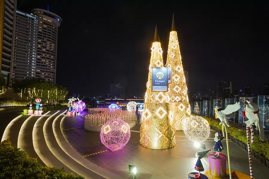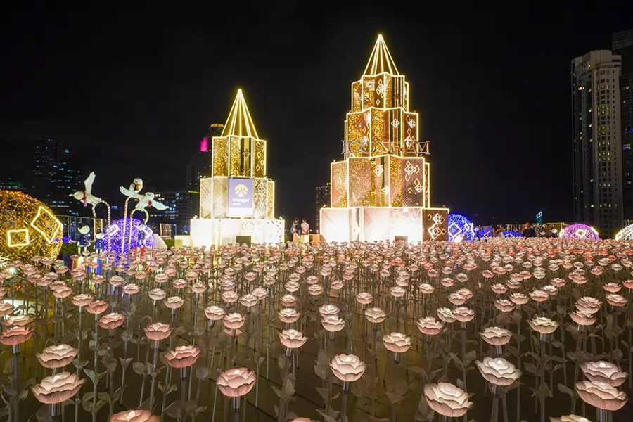 新興購物商場龍頭ICONSIAM,迎接聖誕和新年,以「ICONIC Multimedia Water Features」為主題,在超大的廣場上,精心布置3座閃亮百寶箱堆疊的塔,淡紅玫瑰海加以點綴,配上聲光的水舞秀,讓遊客有3D體的感受。