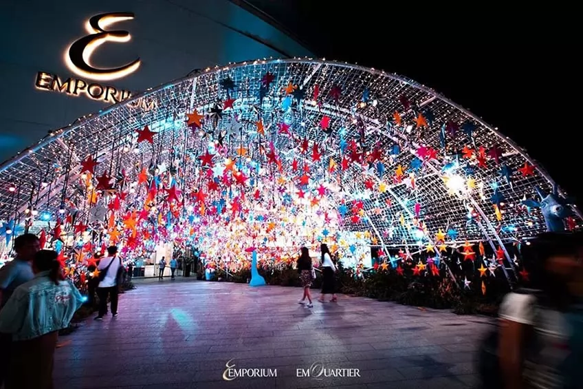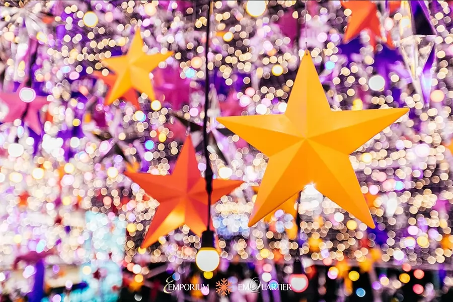 進入Emporium的門口依舊保有閃亮通道的傳統,金黃色的小燈泡點燃下,垂掛各種色彩的五星摺紙,華麗的星光大道,與Emporium的建築相互輝映。