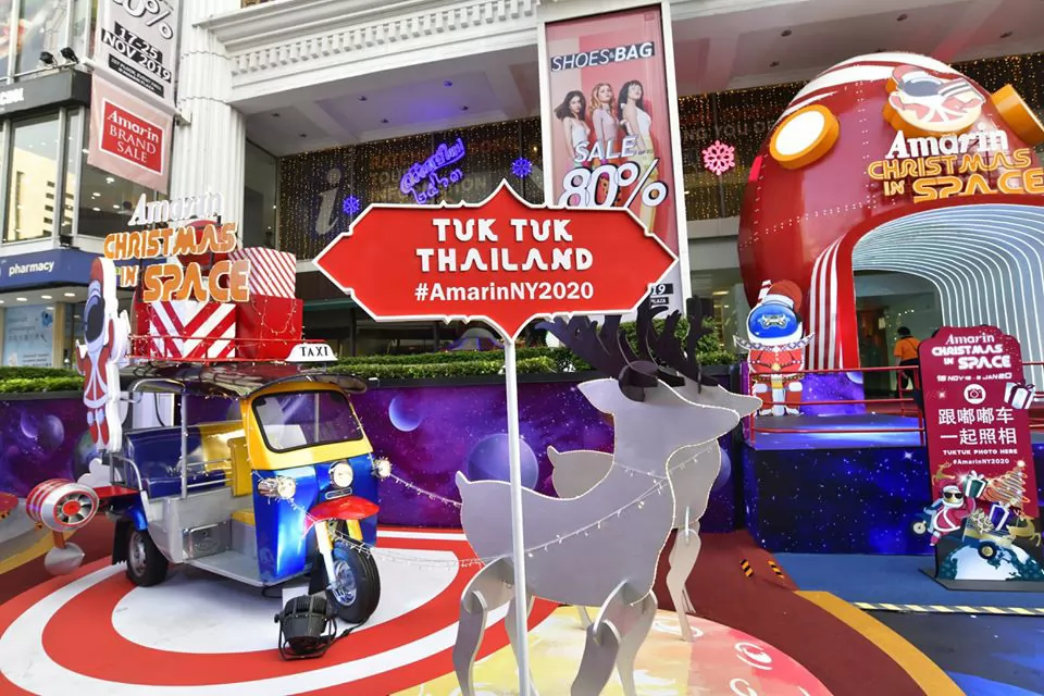 Amarin Plaza以「Amarin Christmas in Space」為主題,打造聖誕和新年的景點!馴鹿拉的不是雪橇,而是泰國標誌的嘟嘟車,泰式的誇張且趣味性十足。