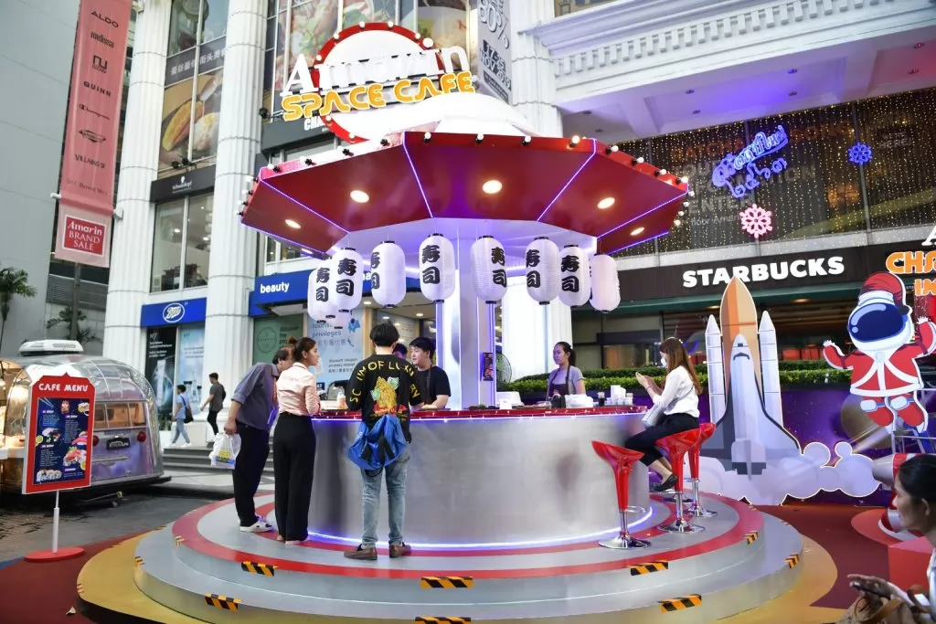 一旁聖誕市集,最引人矚目的圓型吧檯及後方太空梭,讓人感覺來到外太空。