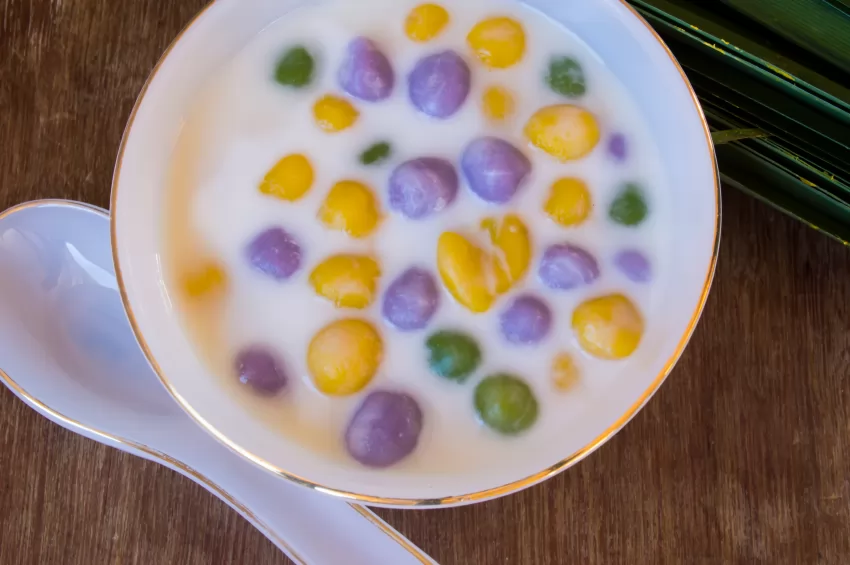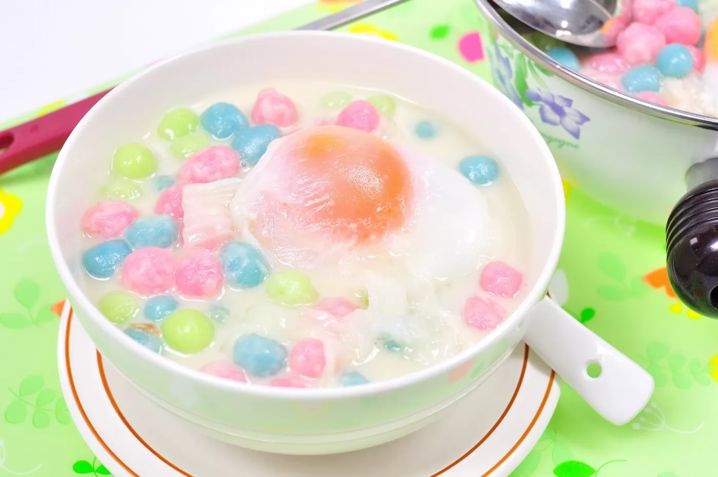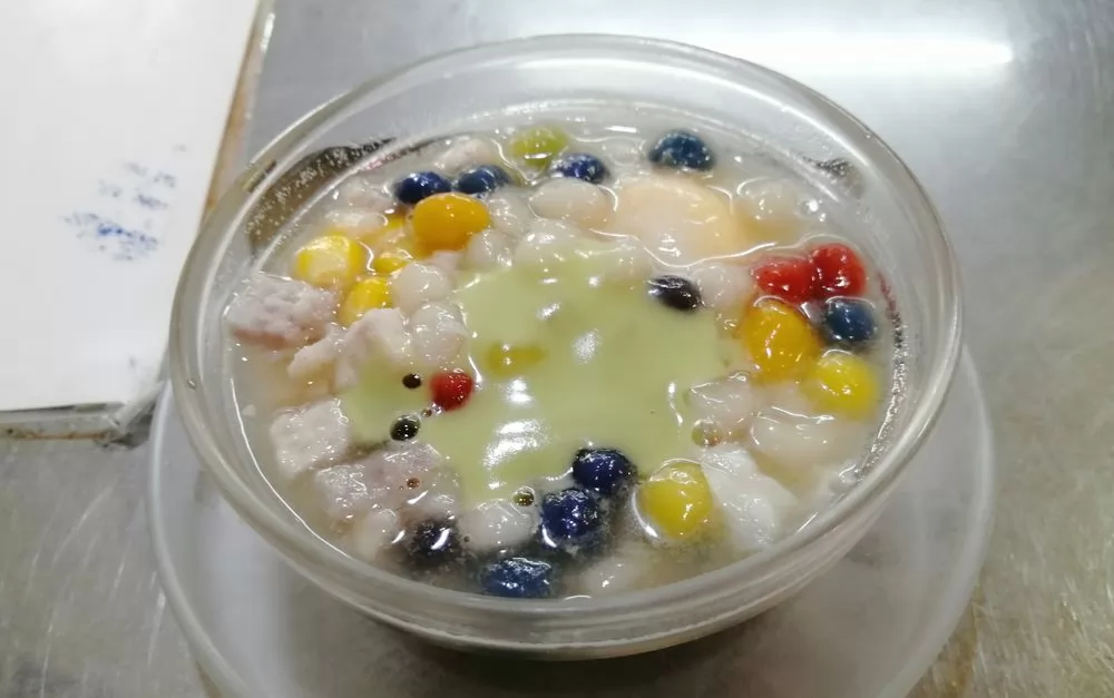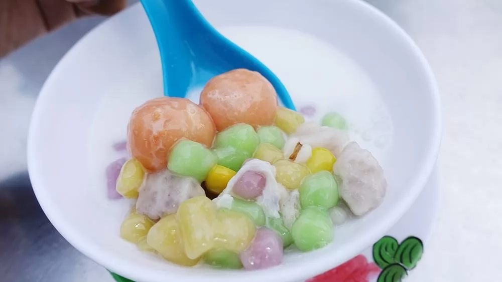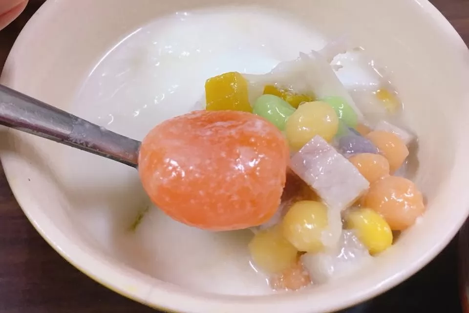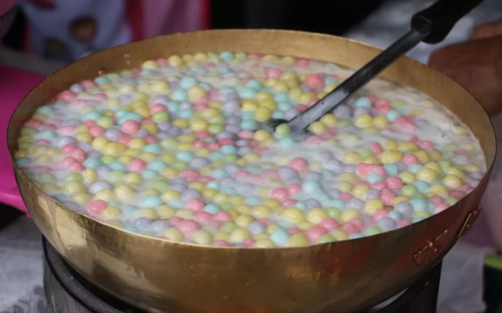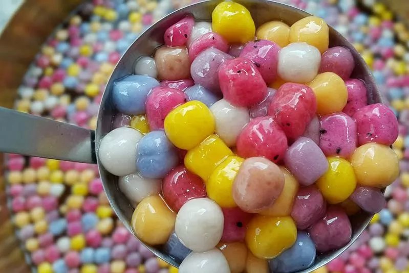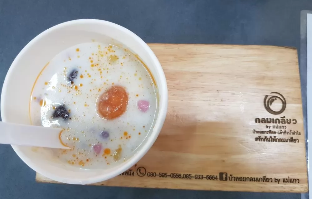 泰式湯圓做的比較小粒,一般所謂的「小湯圓」,沒有餡,五顏六色,再次展現泰國人對顏色的熱愛,非常美觀!看一眼就覺得好幸福的甜點。