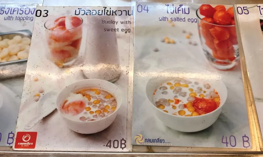 攤前有各式甜點的圖樣單,湯圓以紫和黃色為主,也有灰色的芋頭湯園可選,椰奶汁為主,加甜或鹹蛋,1碗都是40銖,值得一嚐!