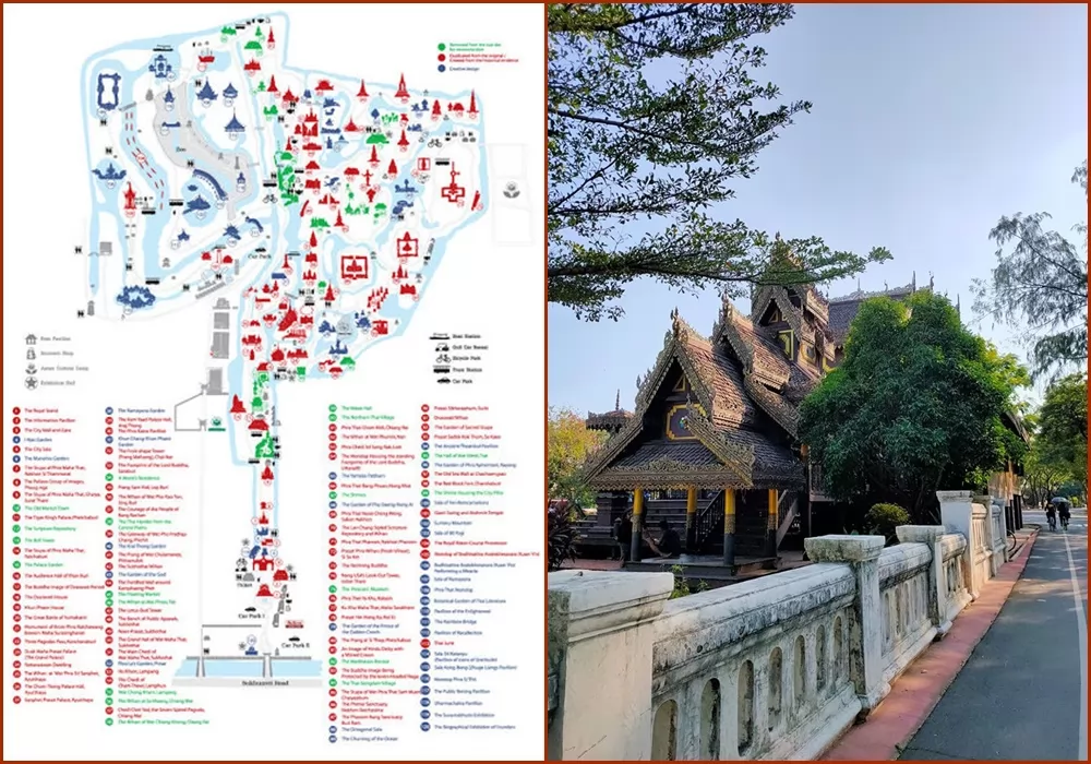 古城按照泰國四大區(南部、中部、東北部、北部)排列,並依照不同時期和特色,把當地重要的歷史建築與雕刻重現在我們眼前。這一座座建築由著不同的年代來建造,它們橫跨的歷史有15個世紀之久,有的還在計畫興建當中。