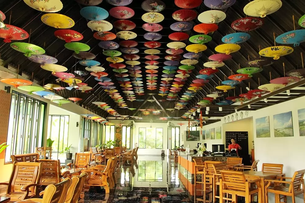 辦理入住手續的接待大廳,用紙傘裝飾得繽紛,很有特色。