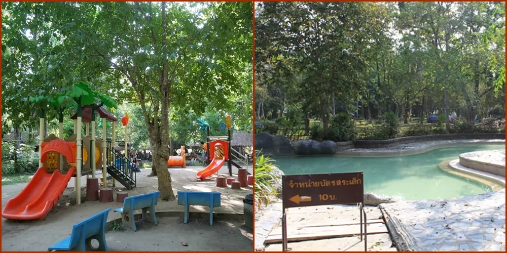 水道下方有適合孩童嬉戲的小水池。如果想要泡湯則有泡湯池,男女分開的公共浴室,以及重隱私的包廂,收費各有不同,公共浴室大人50銖、小孩30銖。