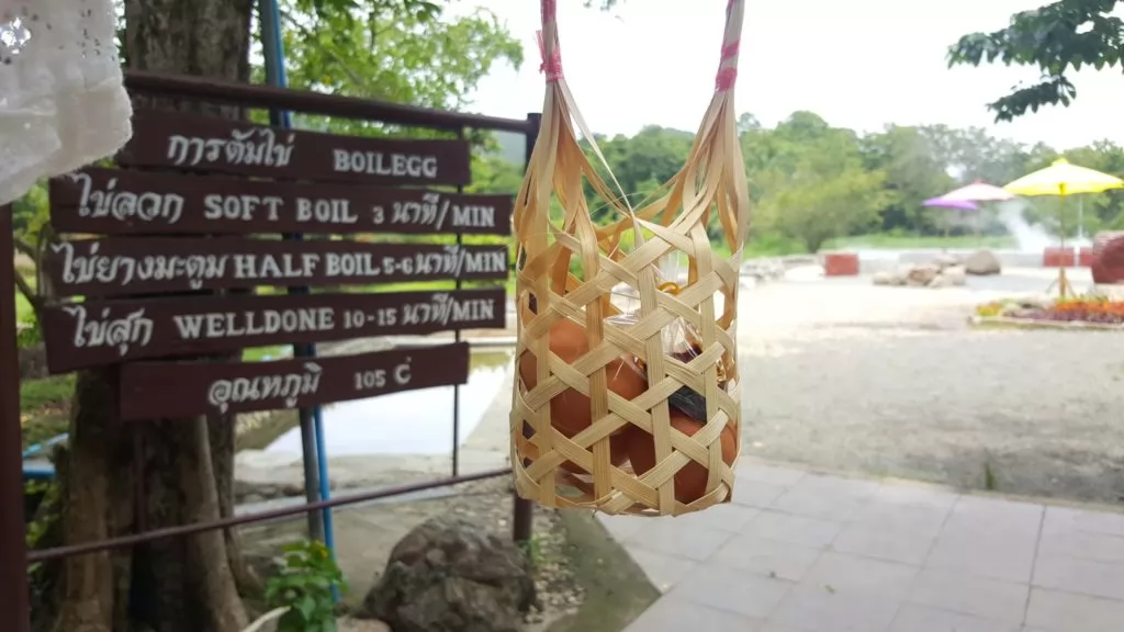 40銖就可以買一小籠雞蛋或者鵪鶉蛋,拿到滾燙的溫泉裡煮,公園還特別貼心的安裝掛籃子的掛鉤,讓雞蛋均勻受熱,方便取用。