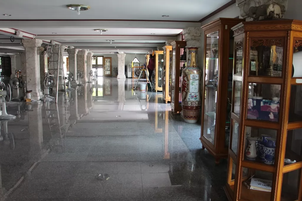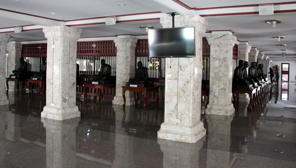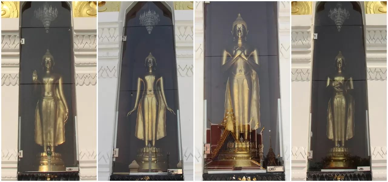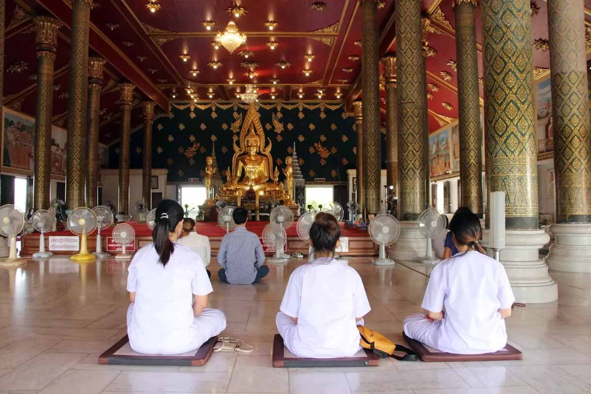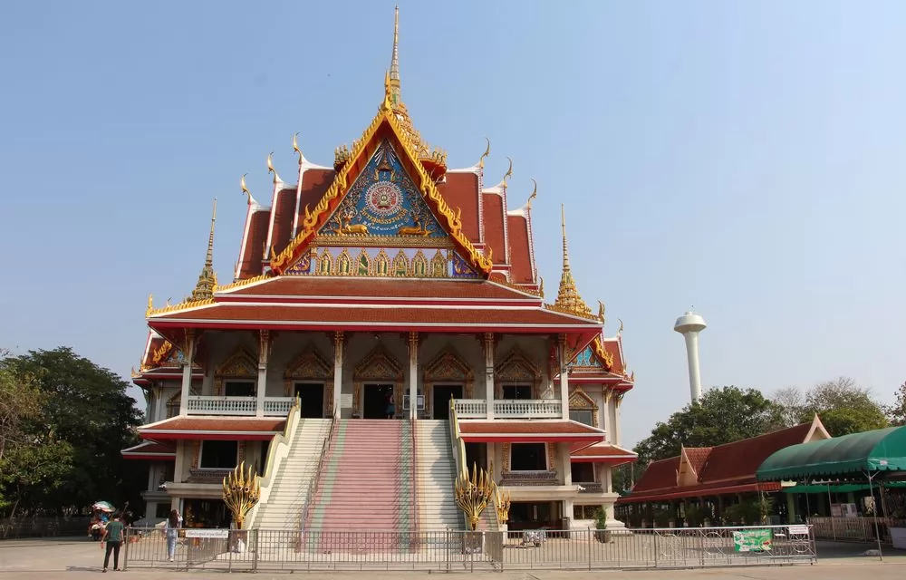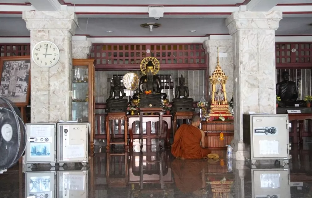 寺院三層高的華麗主殿,Wihan Wisuthithammarangsi (วิหารสุทธิธรรมรังสี),有一座金佛供信徒參拜,脫鞋走上去,肅靜的大殿,有幾位身穿白衣的信徒唸經、打坐,一旁堆疊打坐的軟墊,可以看出這裡是北欖府內著名的禪修地方。