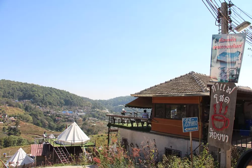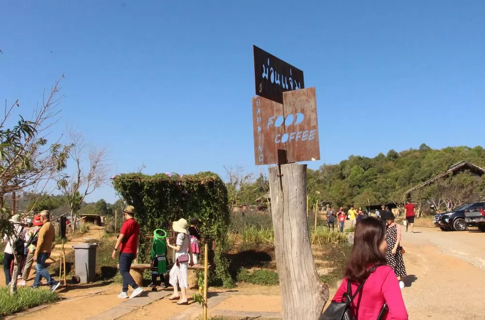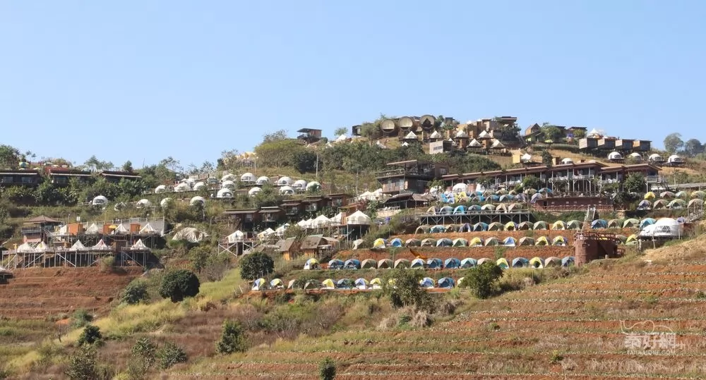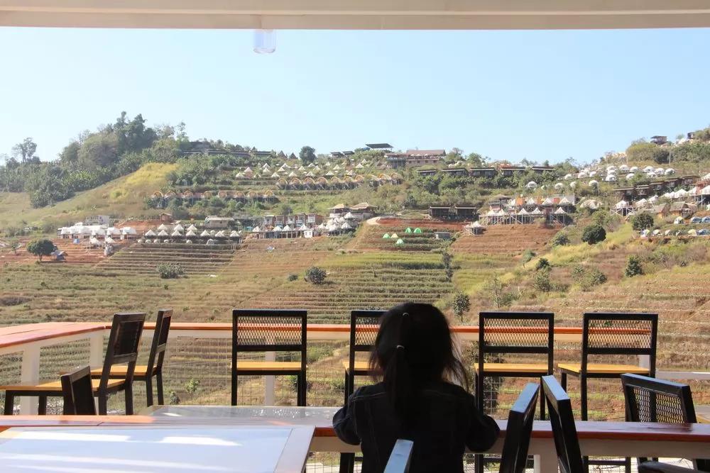 近年來,冬季到山區住露營帳篷,感受寒冷的天氣,變成時尚的旅遊,蒙真山梯田的高層都變成了露營區,各式各樣的帳篷都有,有大有小、帳篷頂有尖有圓,甚至有太空式,裡面甚至有衛浴設備,提供遊客前來體驗,價格不便宜,1晚700銖起跳,而且周末時刻還一帳難求,蒙真山多處山頭都被露營帳篷包圍,一般民宿會隨住宿搭配火鍋美食(價格另計約399-499銖)。