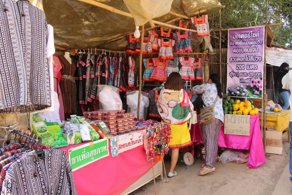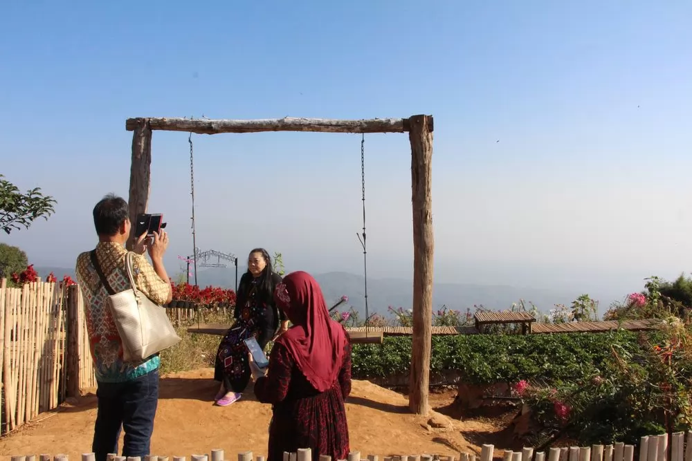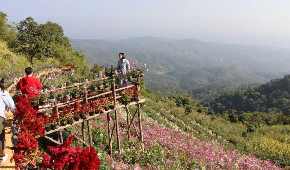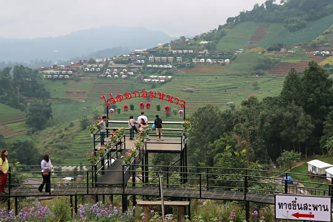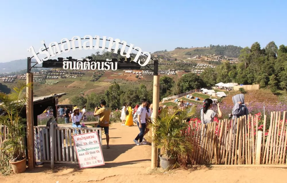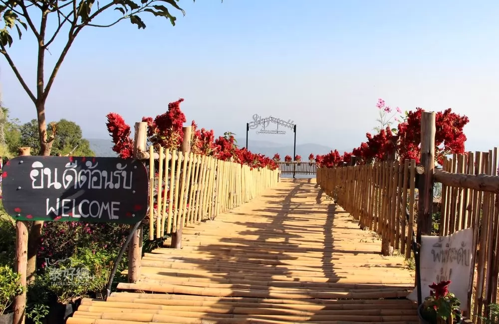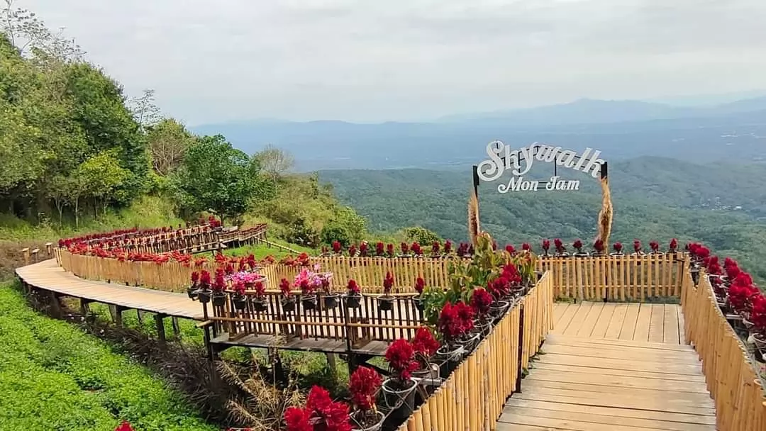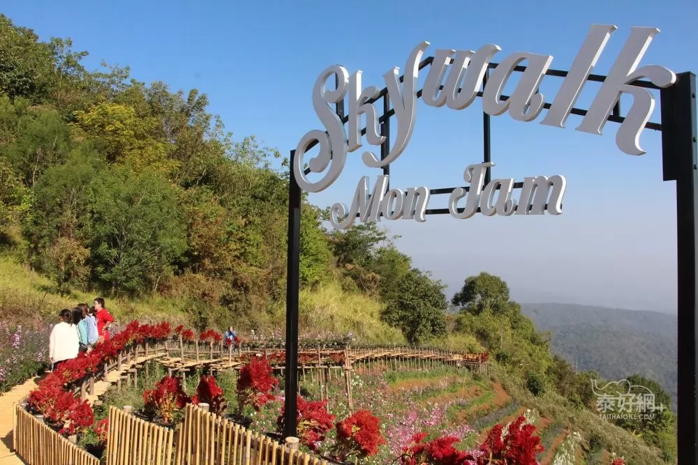 Skywalk ม่อนแจ่ม花園,以竹製作出長長的天空步道,入口處有少數民族服租借的服務,讓遊客可以欣賞綻放的鮮花,或是拍美照,每位遊客需繳10銖的花園維護費。