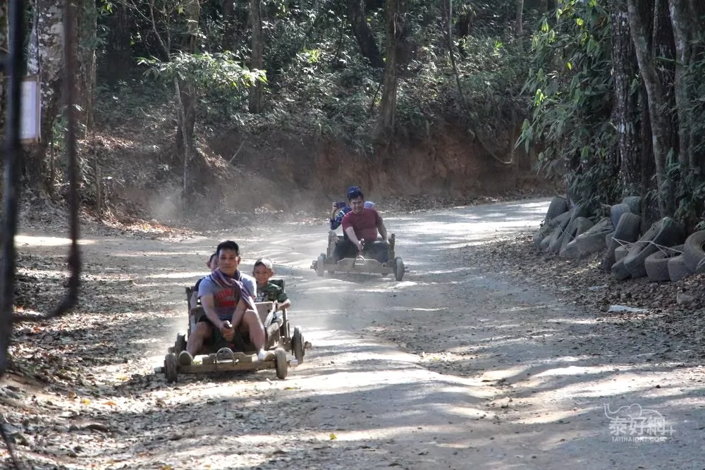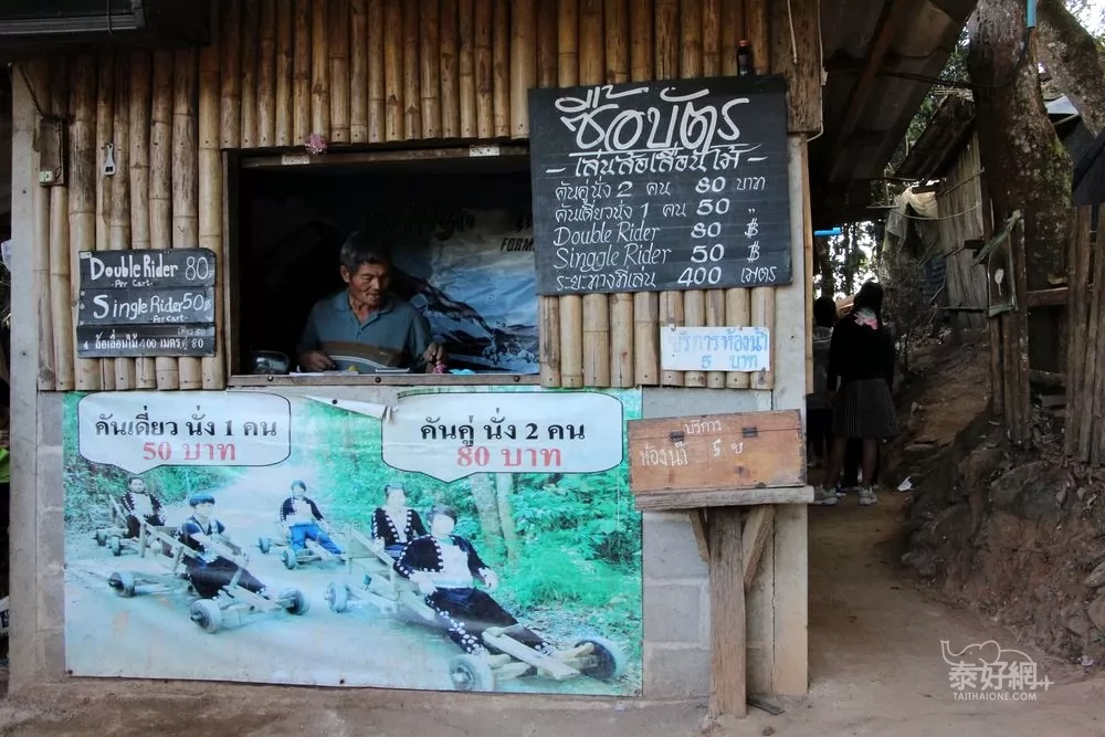 玩木造車的費用不貴,單人座1次50銖、雙人座1次80銖,需要先買票,然後等到一定數量後,業者會將人帶木造車拉上坡頭,然後讓遊客駕駛木造車衝下坡地來,因為是沙土路,車速不是很快,還是讓小孩及女生玩得開心!
