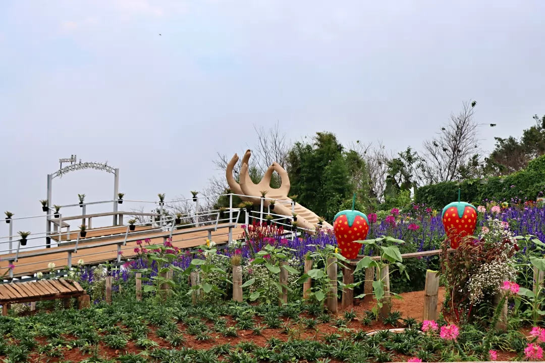 草莓花園:位於Skywalk區旁邊,同樣坐擁180度開揚山景,位置不錯,鮮花和草莓各佔一半,草莓收成期是一、二月份,其他時間除了有茂盛的鮮花做背景,亦可於竹製的平臺拍些遠景,場內還有木鞦韆和木車給人拍照,也有道具花籃供租借。
