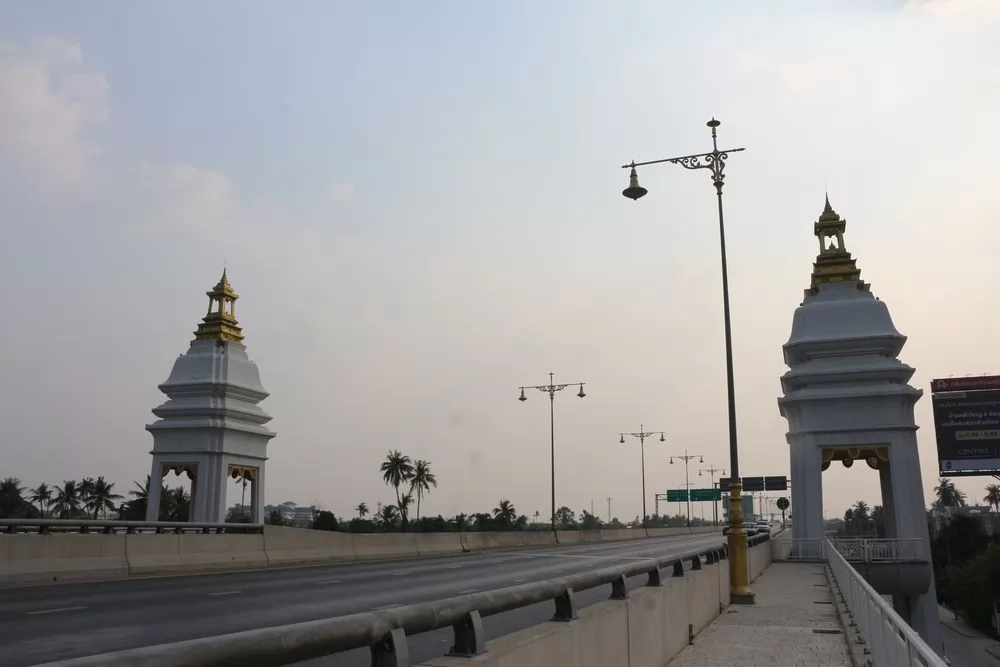 由日本和泰國友誼合作建造,2012年5月施工,兩年後(30個月)才完工,鋼索大橋,河兩側各1座橋墩,樑柱呈三角形分散的鋼索支撐橋體,夜晚藍、黃色燈光將整座大橋裝飾得美輪美奐。