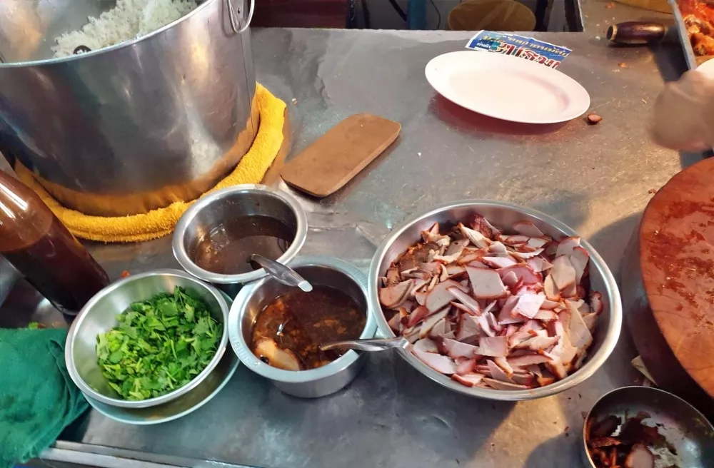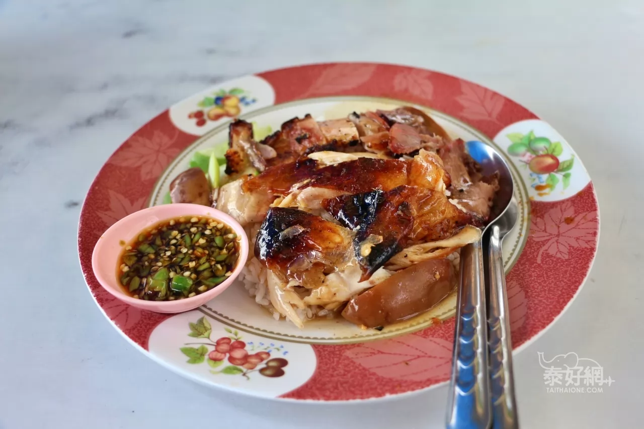 招牌的紅燒豬肉飯,有薄切叉燒、香脆燒肉及泰式臘腸,另有半顆水煮蛋,重點是每盤只要50銖,吃起來,燒肉香脆,臘腸不會太鹹膩,還是值得一試。
