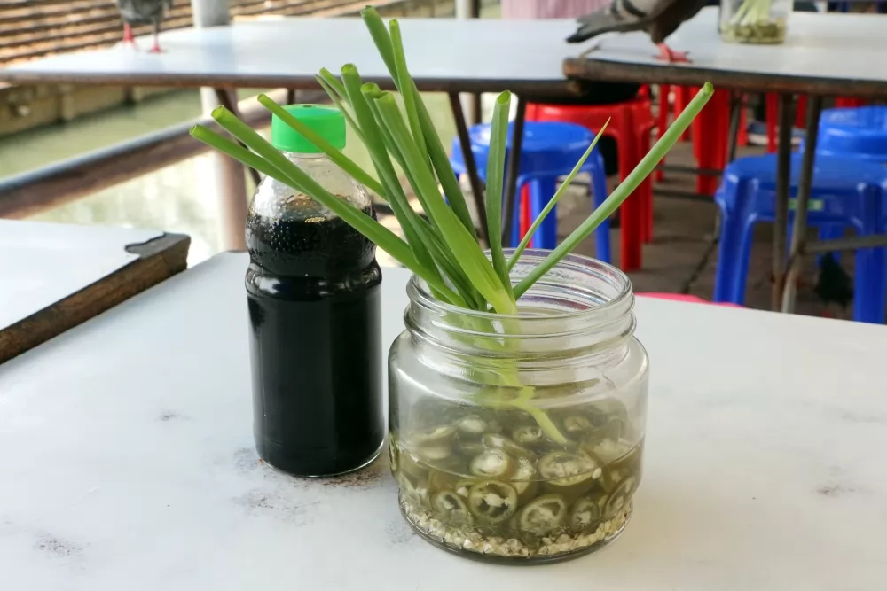 這家的紅燒豬肉飯,沒有淋上偏甜的紅汁,也沒有香腸,但是燒豬肉料多實在,滴油的皮脆帶點甜,附有半顆滷蛋,幾小片黃瓜,搭配青辣椒和醬油的沾料,這樣吃起來很爽口,口味重的可加青辣椒酸水,或者可以搭配生蔥來吃,別有番不同的滋味,當地人就喜歡這樣吃。