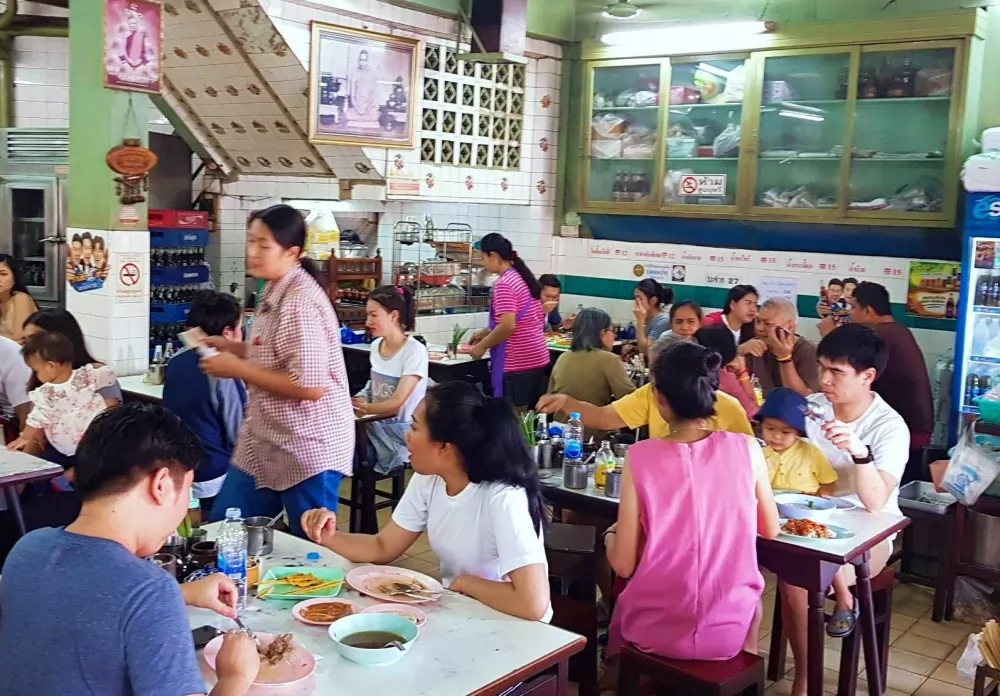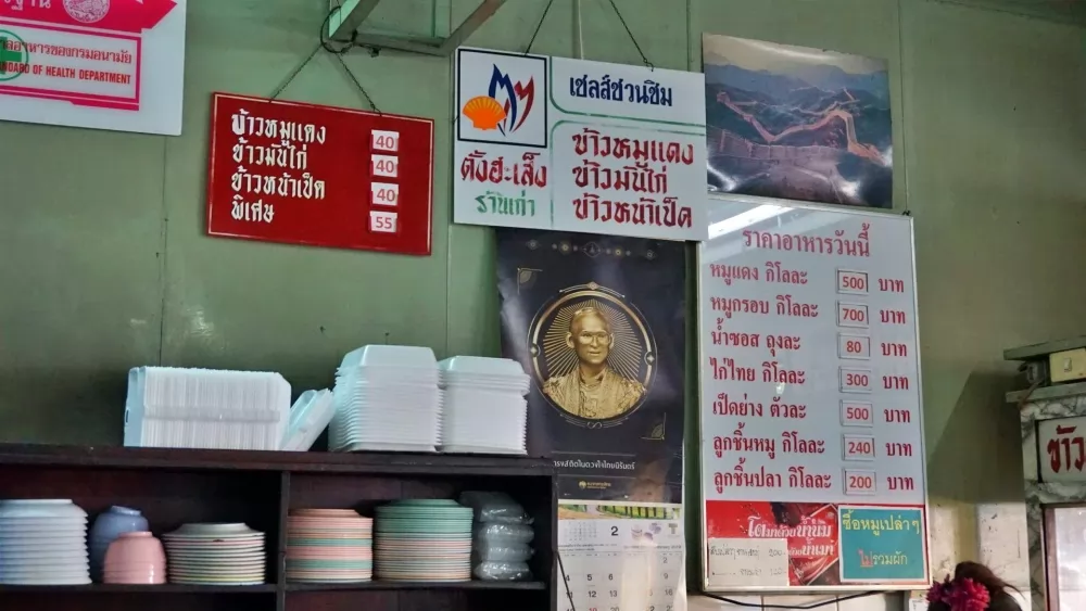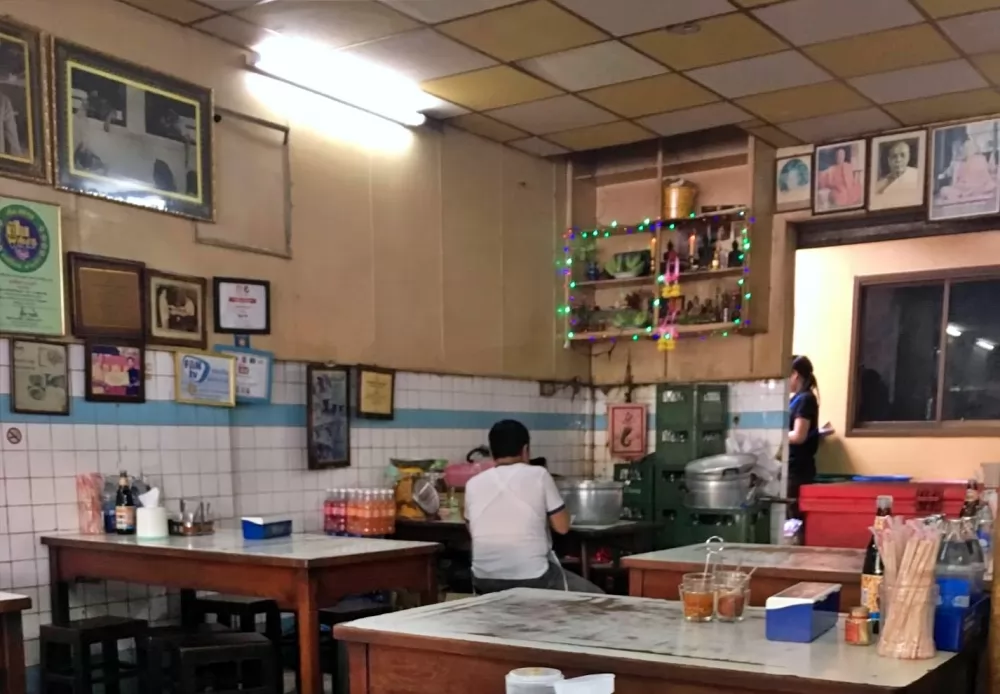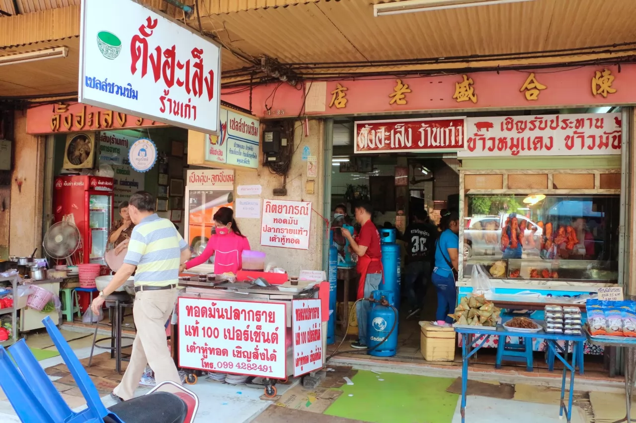 這家ตั้งฮะเส็ง (ร้านเก่า)老店有「陳合盛老店」中文招牌,很好辨認,店前有賣炸豆腐的攤位,玻璃櫥窗也能看到懸掛著紅豔的豬肉,光是這色、香味的誘惑,更何況有多年打下來的知名度,吸引很多人前來一飽口福。
