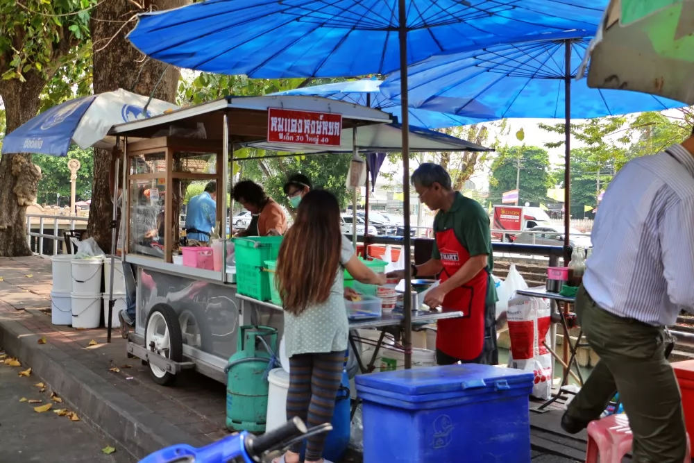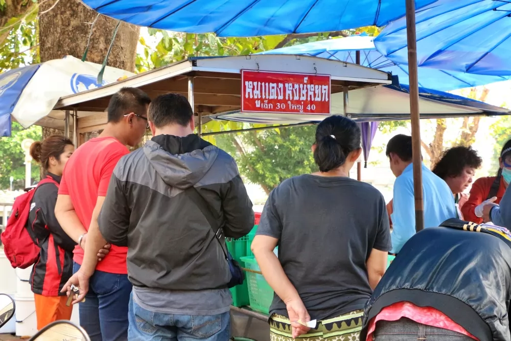 從火車站出來,傳統市場在旁邊,順著河道走,紅唷豬肉飯(ข้าวหมูแดงหงษ์หยกนครปฐม)就在河道邊,雖然是露天的攤子與座位,人氣卻十足,想吃有得等。