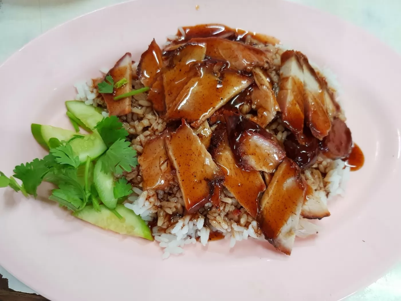 一盤白飯,加上廣式叉燒、脆皮豬肉,配上甜味的廣式香腸,再淋上紅汁,幾片黃瓜和香菜,只要40銖,吃起來有別於一般的叉燒肉飯,偏甜。