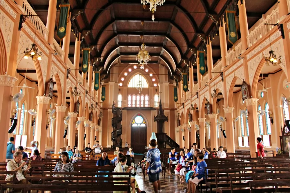 步入教堂,外觀與內部裝飾都是非常精美,百年歷史的瓷磚地板,兩排棕粉色的柱子支撐着巨大的穹頂,整齊擺放的木質座椅供信徒來此作禮拜。