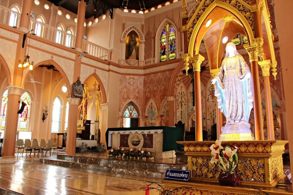 教堂內的聖母雕像,裝飾極盡奢華,身上幾乎完全覆蓋着黃金、寶石和瓷釉,據說,這是世界上唯一鑲嵌寶石的聖母像。來到尖竹汶,不妨感受一下這座泰國最大最美麗的法式教堂的風采。