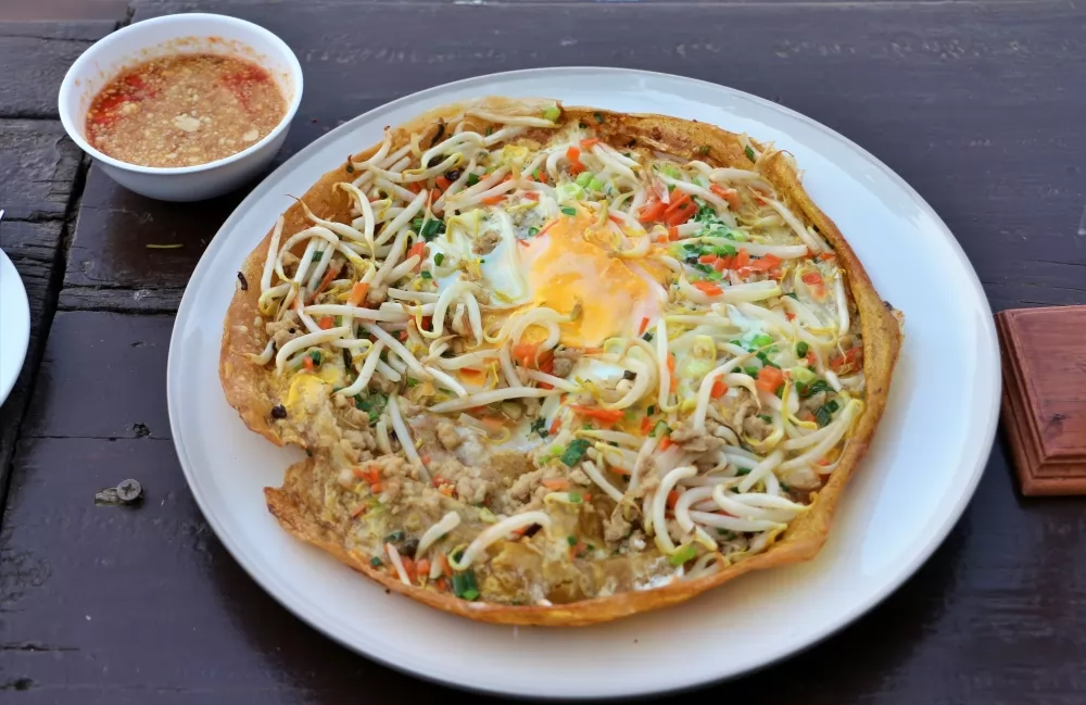 不過,值得推薦的是阮氏麵包,越南口味的薄披薩,加豆芽菜,配上特有的沾料,口味獨特,1盤99銖。