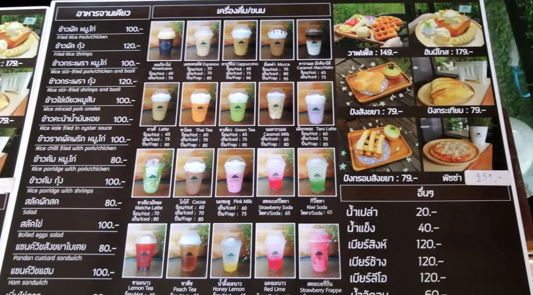 咖啡、飲料都有很多選擇,價格在60-90銖間,冰拿鐵75銖。