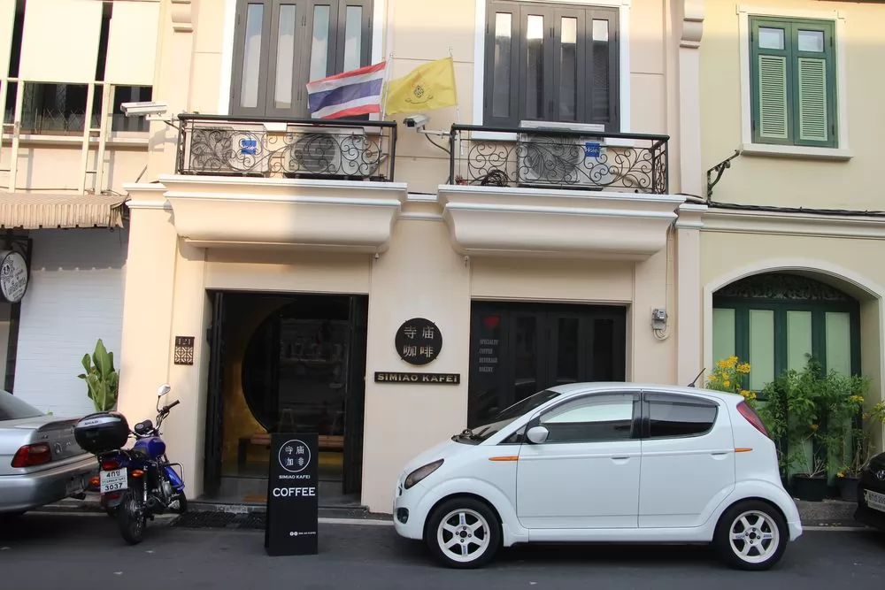 Simiao Kafei,很奇葩的店名,先拼音念一遍,不用懷疑,這就是「寺廟咖啡」,對面就是老城皇家寺廟拉查波比托寺(Wat Ratchabophit),奶黃色的兩層聯排小樓,非常惹眼。