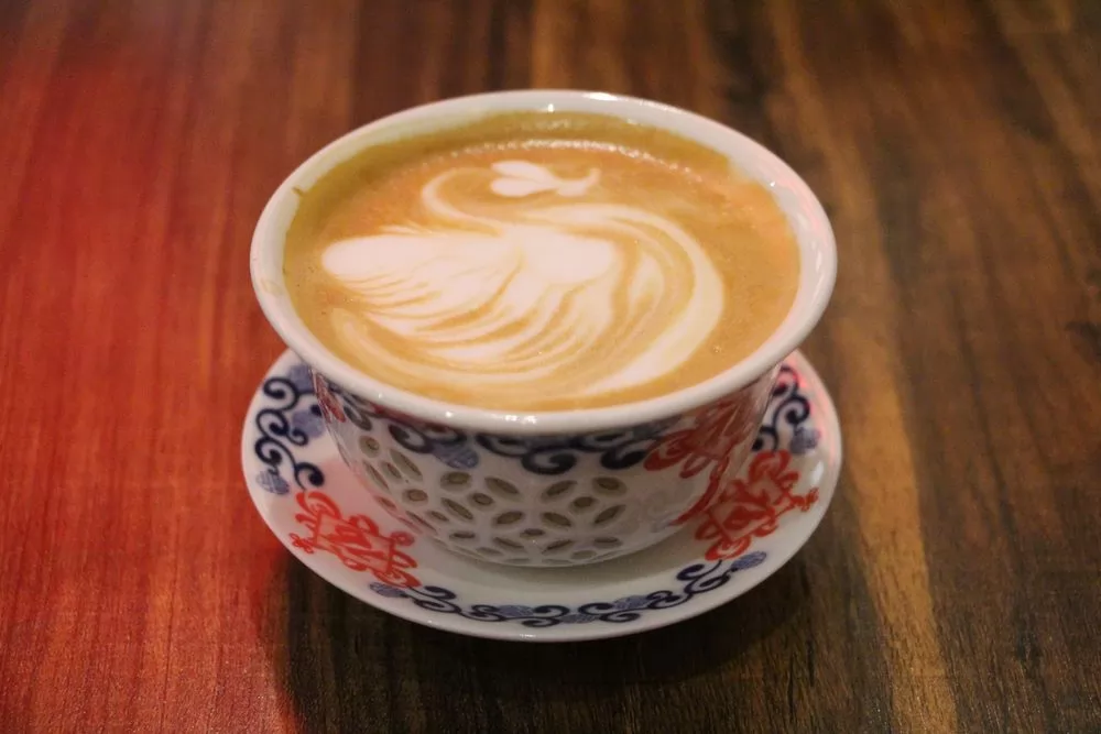 咖啡價格在100泰銖左右。老闆推薦Piccolo Latte,中式託盤配彩陶杯登場,高顏值。