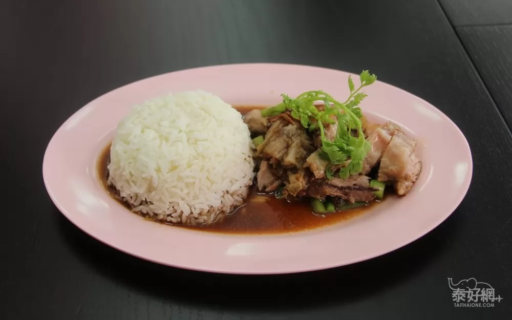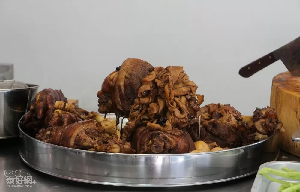 看到一大鍋滷好的豬腳和豬腸,就要流口水了,點1盤(50銖),豬腳滷燉得剛剛好,豬腳肉有肥有瘦很入味,肉質軟嫩,配上白飯和滷水,好呷!令人舒服的是用餐環境乾淨,足證老闆的用心,更何況是賣了百年的豬腳飯。