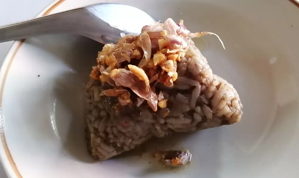 老奶奶還會在店裡包豬血飯(Khao Kan Chin;ข้าวกั้นจิ้น;考甘京),蒸好後佐以蝦米和乾蔥油吃,1包15銖,值得來體驗泰北獨有的美食。