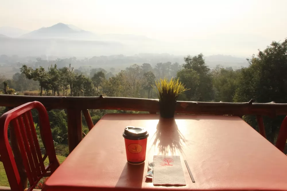 建議早上日出的時候來,可以看到陽光穿過山霧的美景,再喝杯美式咖啡(35銖)暖暖身,開啟美好的一天。