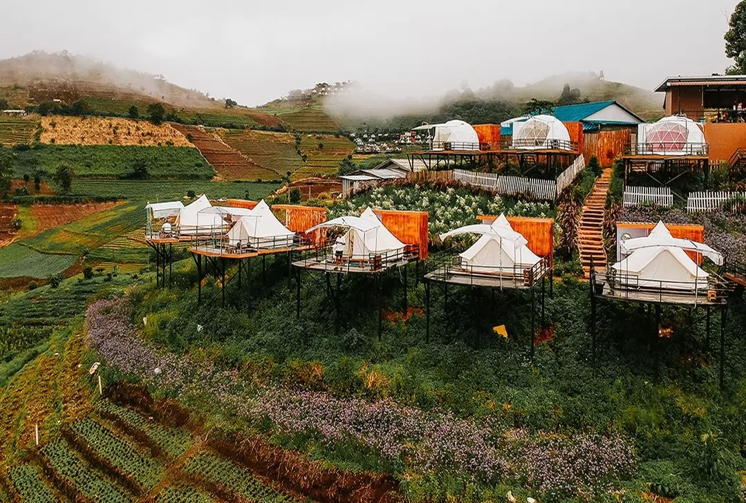 蒙真山梯田的高層都變成露營區,各式各樣的帳篷都有,甚至有太空式,裡面甚至有衛浴設備,提供遊客前來體驗,價格不便宜,1晚700銖起跳,而且周末時刻還一帳難求,一般隨住宿搭配火鍋美食(價格另計約399-499銖)。