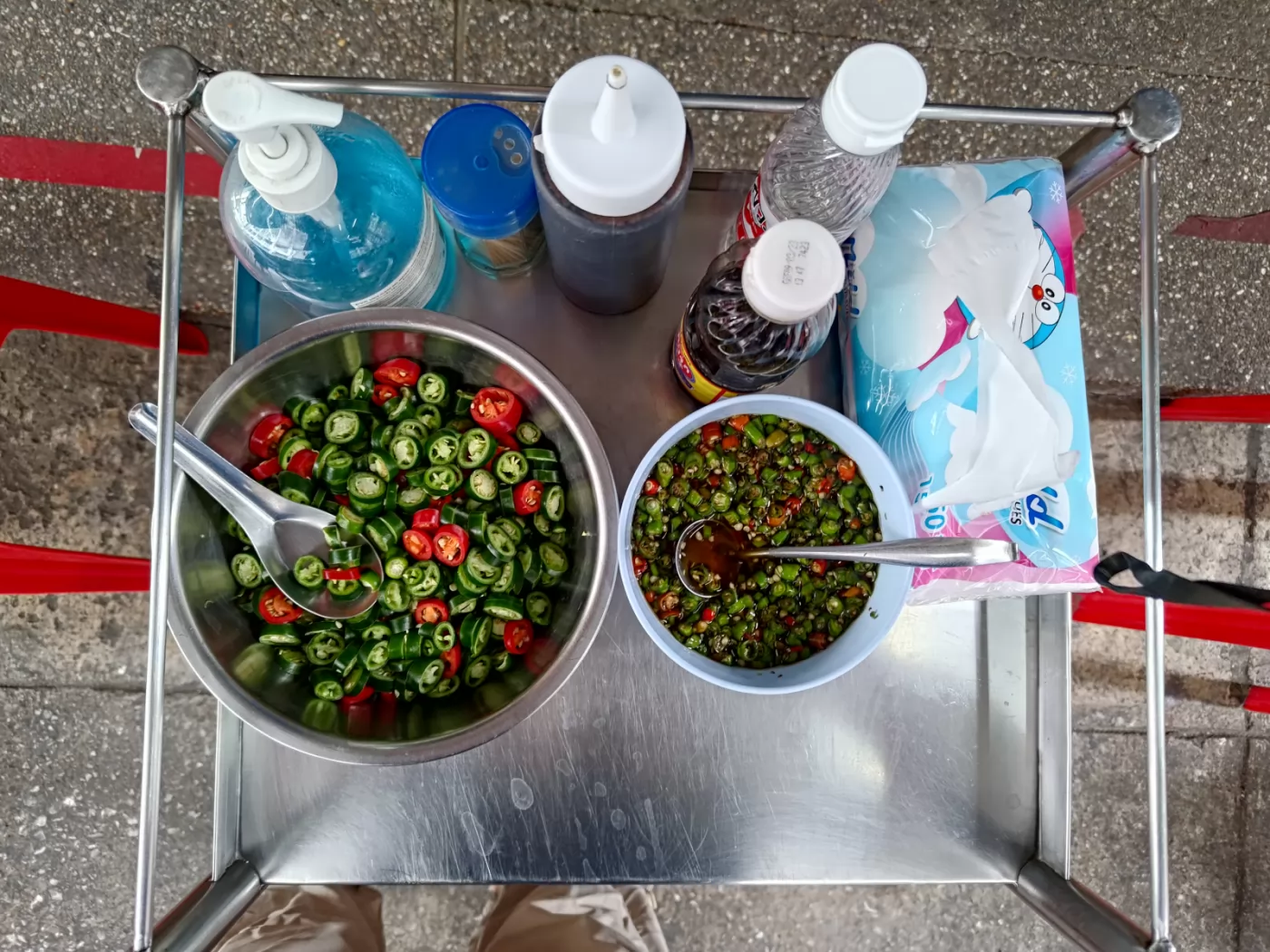 攤車旁有辣椒、魚露等佐料自取,也有漱口盅裝著的冰茶自取。