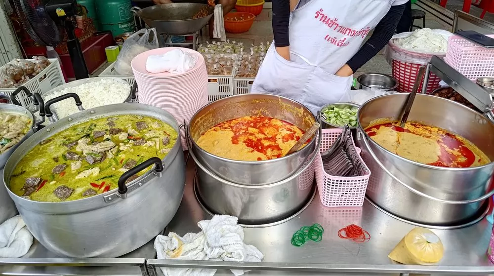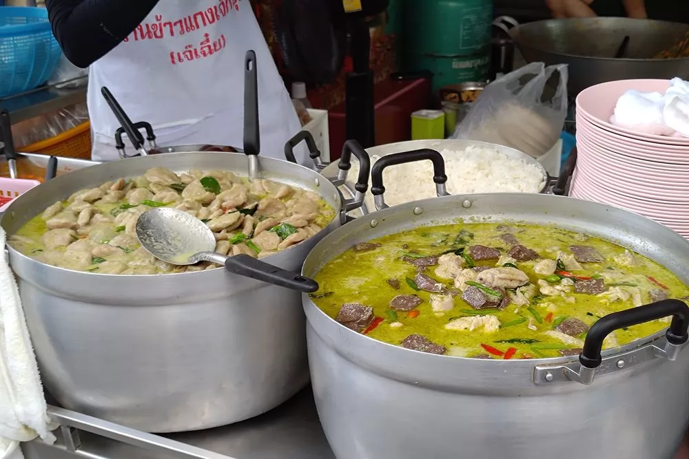 Jek Pui curry賣超過70年,以泰式咖哩飯為主,1大鍋白飯(現在也有涼米線)和幾鍋泰式咖哩(青咖哩、紅咖哩、黃咖哩、Massaman咖哩等),款式多變化,配上簡單配菜(小煮雞蛋、豬肋骨,香腸,炒筍,炒肉碎等)。