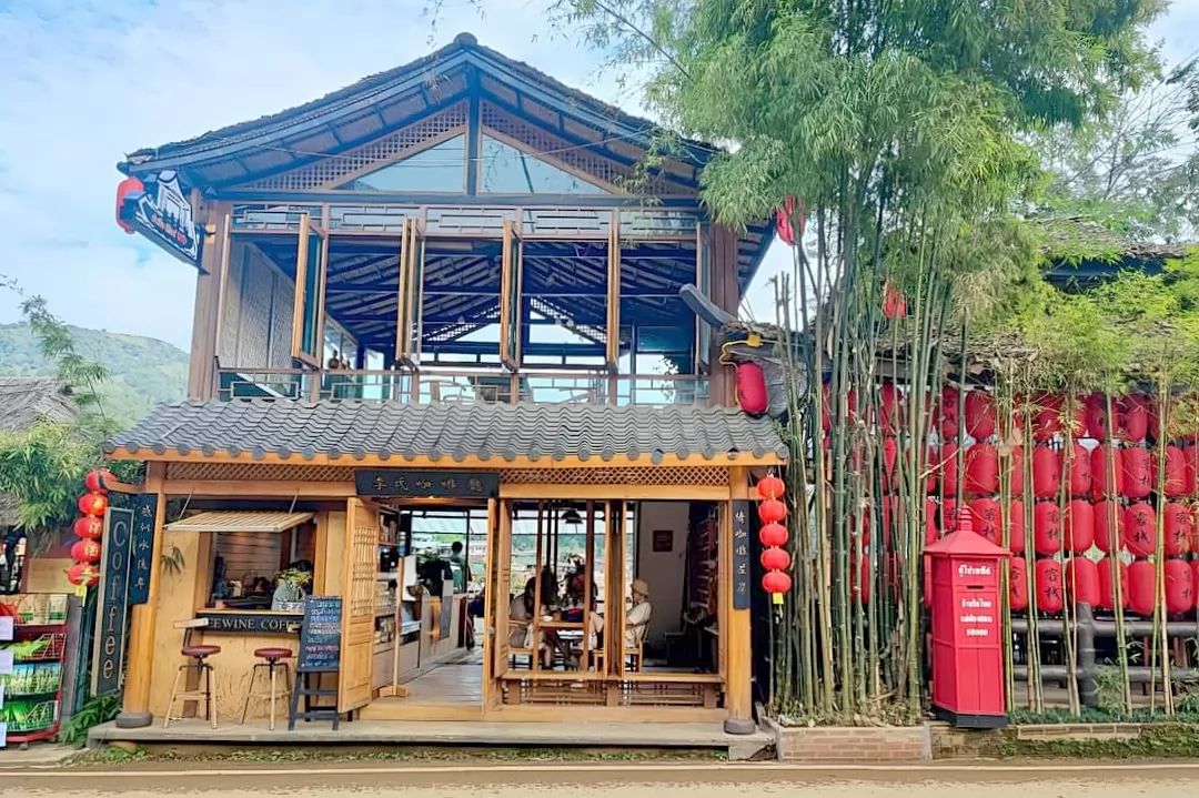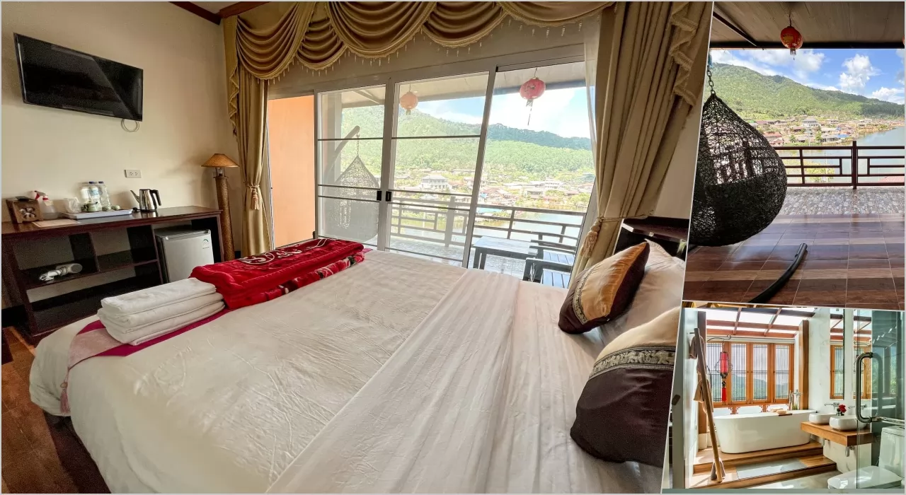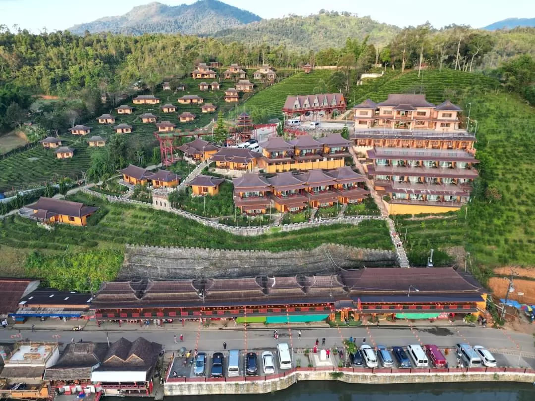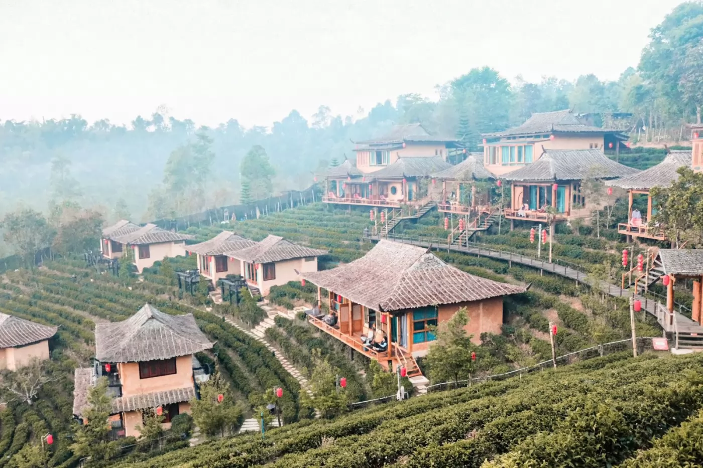 中式民宿:村落環繞著中間的湖而建,有幾家旅店的住房建在茶園上,充滿濃郁中式的裝潢風格,讓疫情期間難出國的泰國人有來到外國的感受,一般的房價不貴(雙人房在2000銖左右),住起來舒適,還可以俯瞰下方的湖景。