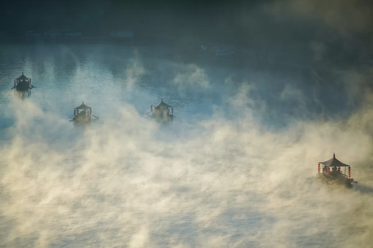 冬季早晨起霧,再加上金黃色的晨光灑在湖面上,是非常引人的風景。