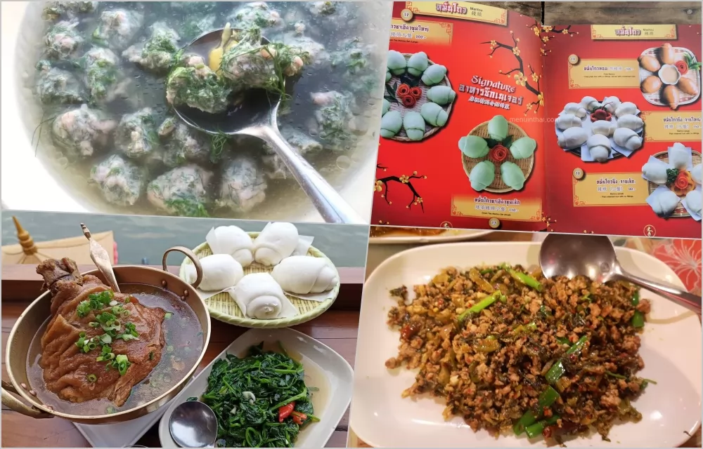 李氏餐廳建在湖邊,可以邊吃邊賞湖景,這裡的豬腳大燉+白饅頭(390銖)、炒絲瓜尖或豌豆尖(90銖)、茴香肉丸湯(160銖)都值得推薦。