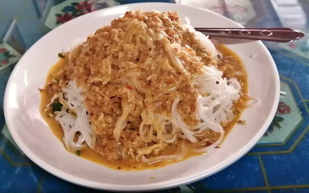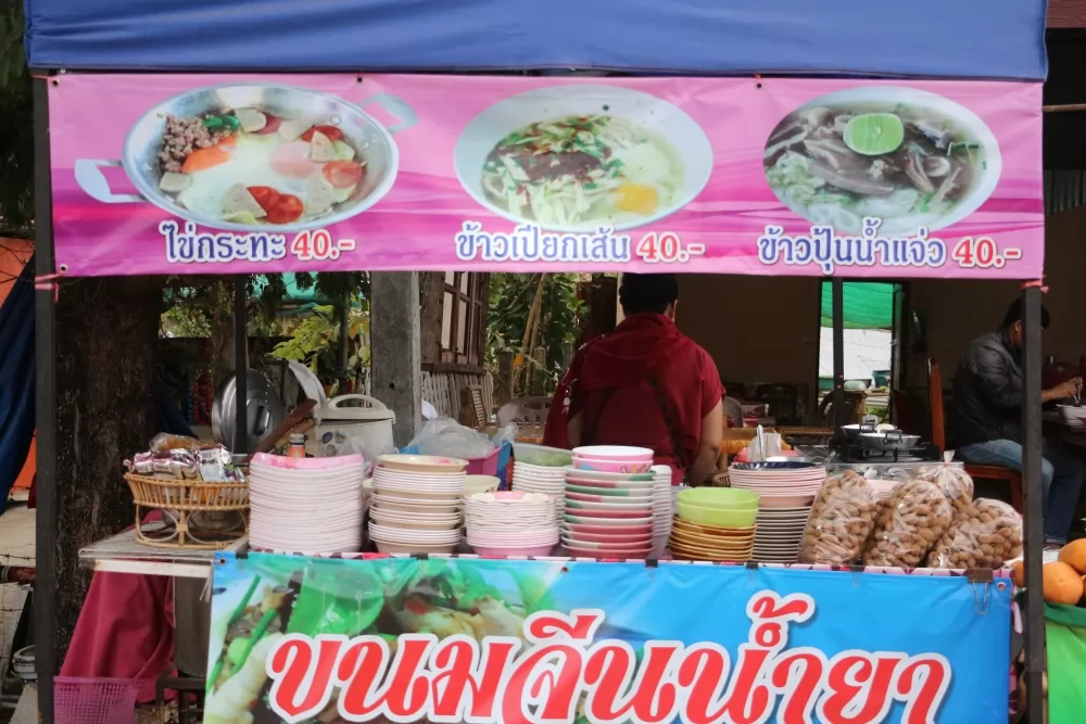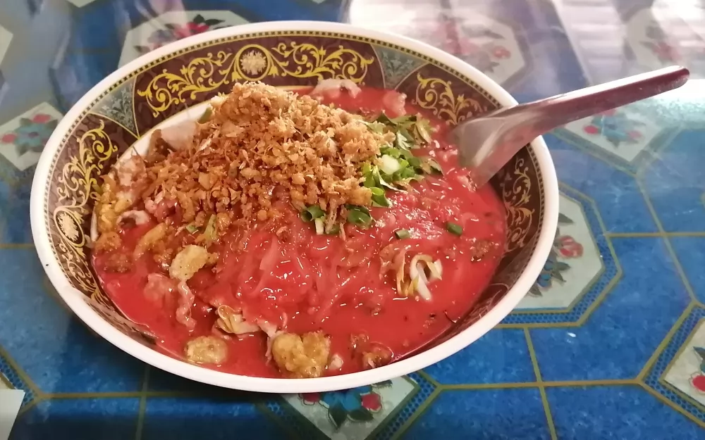 午餐時間到了,可以步行到這家美食店จุ่มนัวยายพัด,70年的老店,賣的是泰式涼米線(多種口味,30-40銖),推薦的是這碗在地的紅粉粿條(จุ่มนัว),店的招牌美食,不辣,紅麴帶有一點點的甜味,1大碗40-50銖。