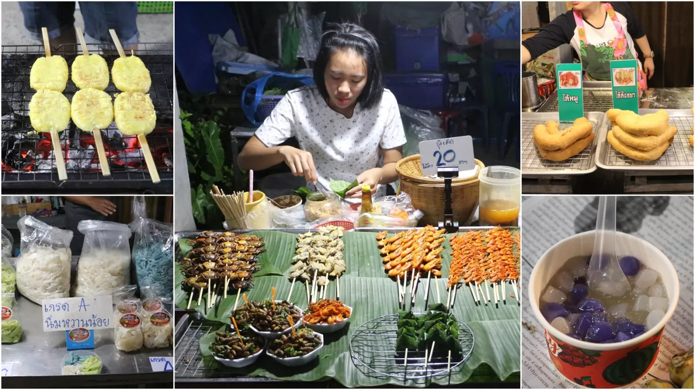 值得推薦的美食有,原汁原味的鹽烤蝦串(1串20-30銖);烤黃糯米餅(1個10銖);乾椰肉片(1小包50銖);芋頭湯圓的甜點(1碗35銖);清康特色的包餡(豬肉、香蘭葉醬汁、香蕉)油條(1條30銖)等,輕鬆就解決晚餐。