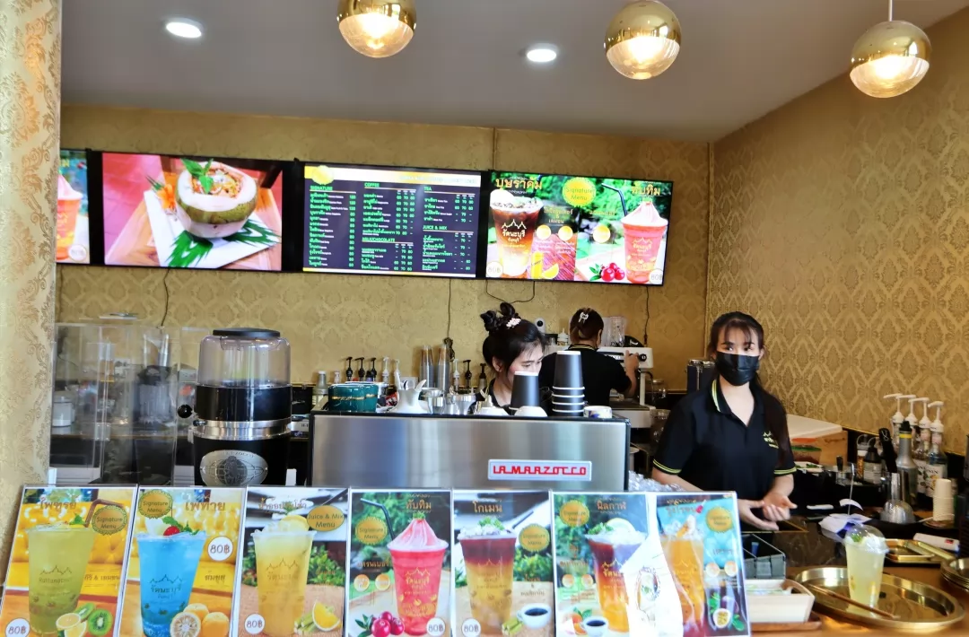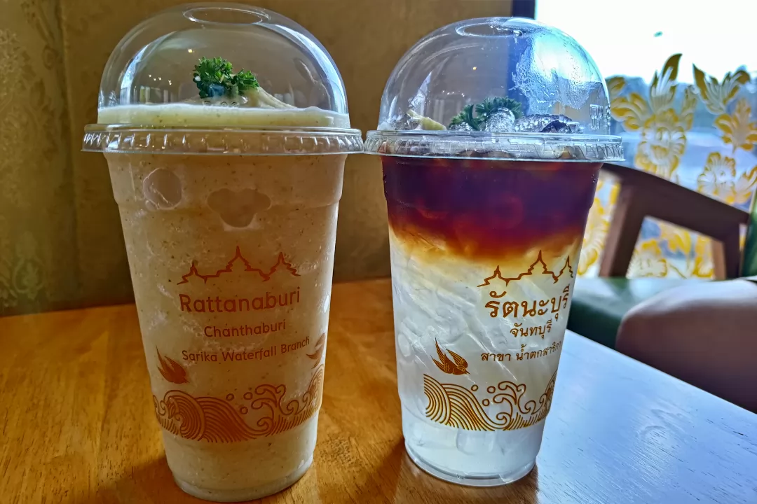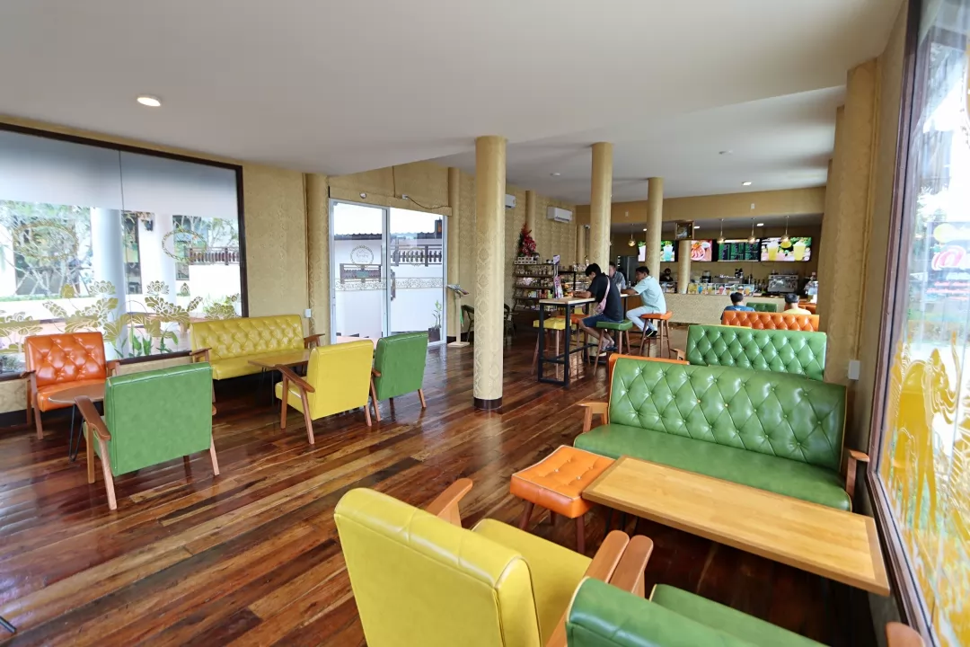 裡面是飯店和餐廳,公路旁的建築是Rattanaburi咖啡店,金色壁紙有點像在寺廟裡的感覺,配上有點復古的椅子,提供咖啡、混合飲品和其他甜點。