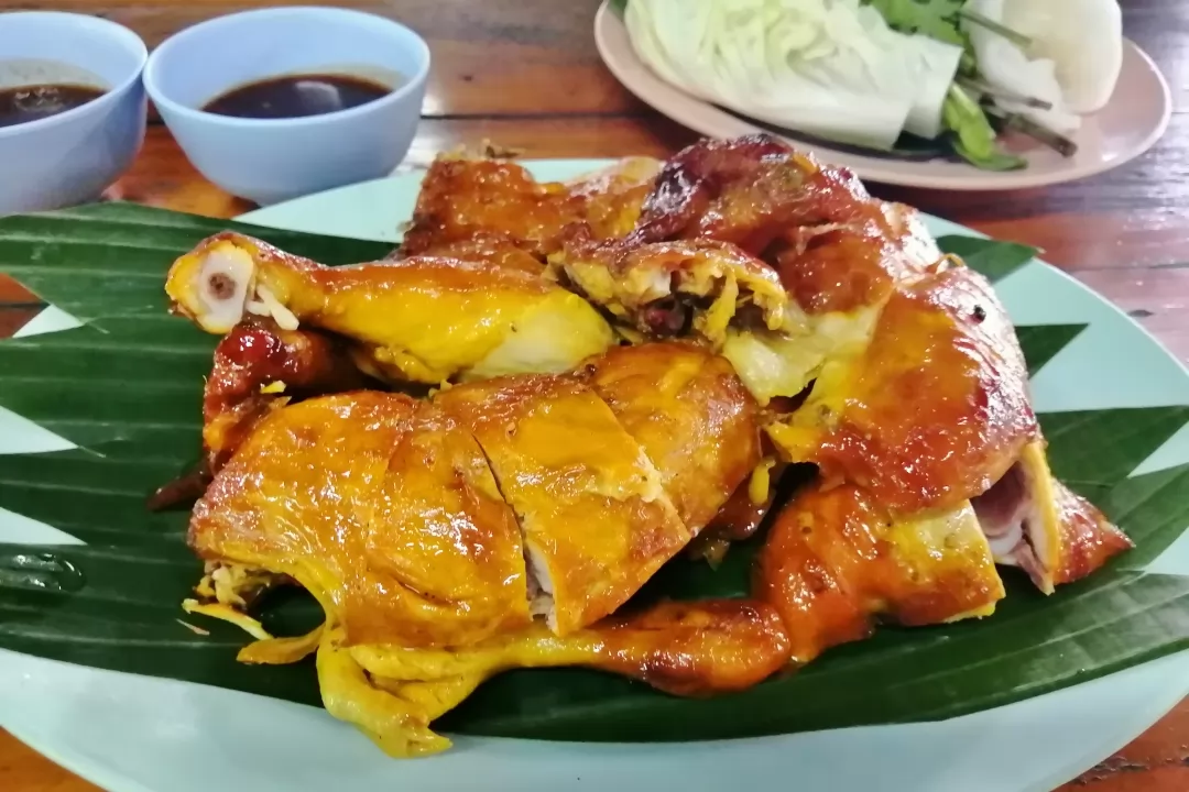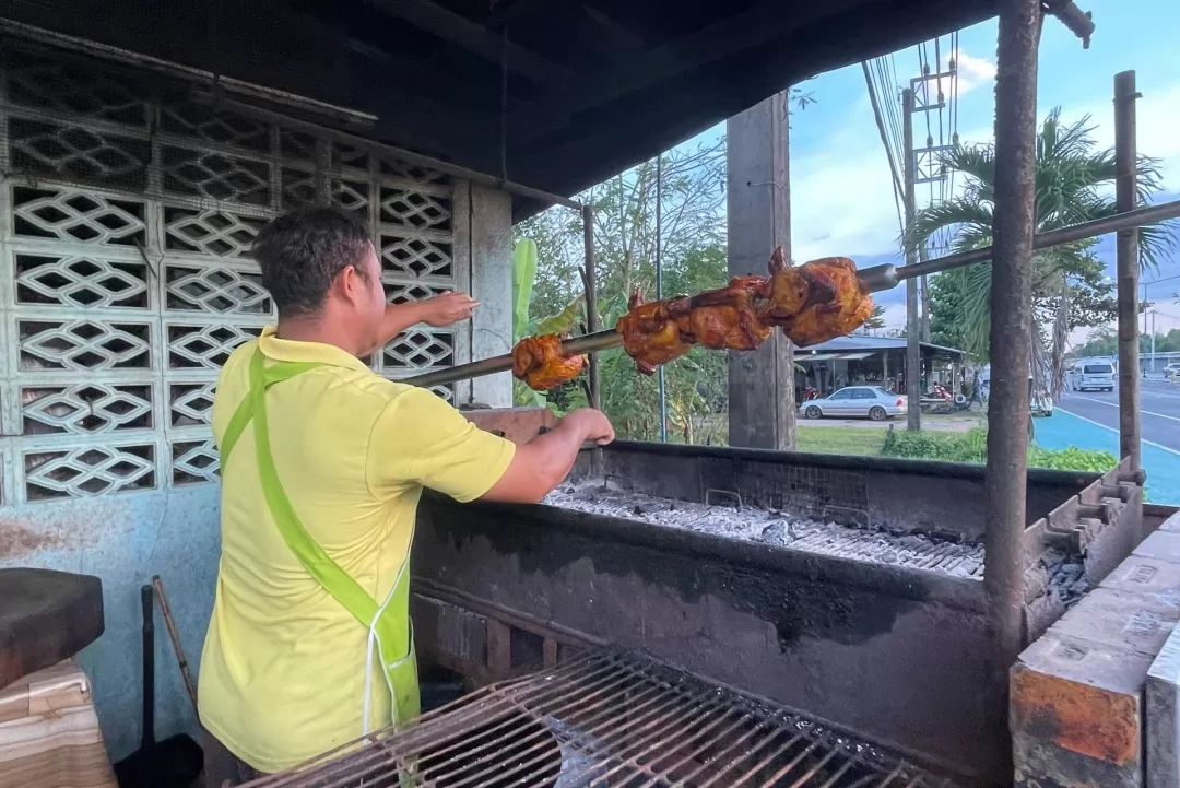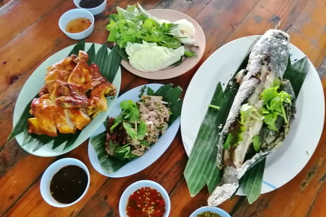 午餐時間來到這家兩姐妹烤雞餐廳(ร้านไก่ย่างสองสาว ),烤得金黃的雞肉,是來這裡必吃的菜餚,搭配鹽巴烤魚和涼拌碎豬肉、生菜,傳統泰式的一餐。