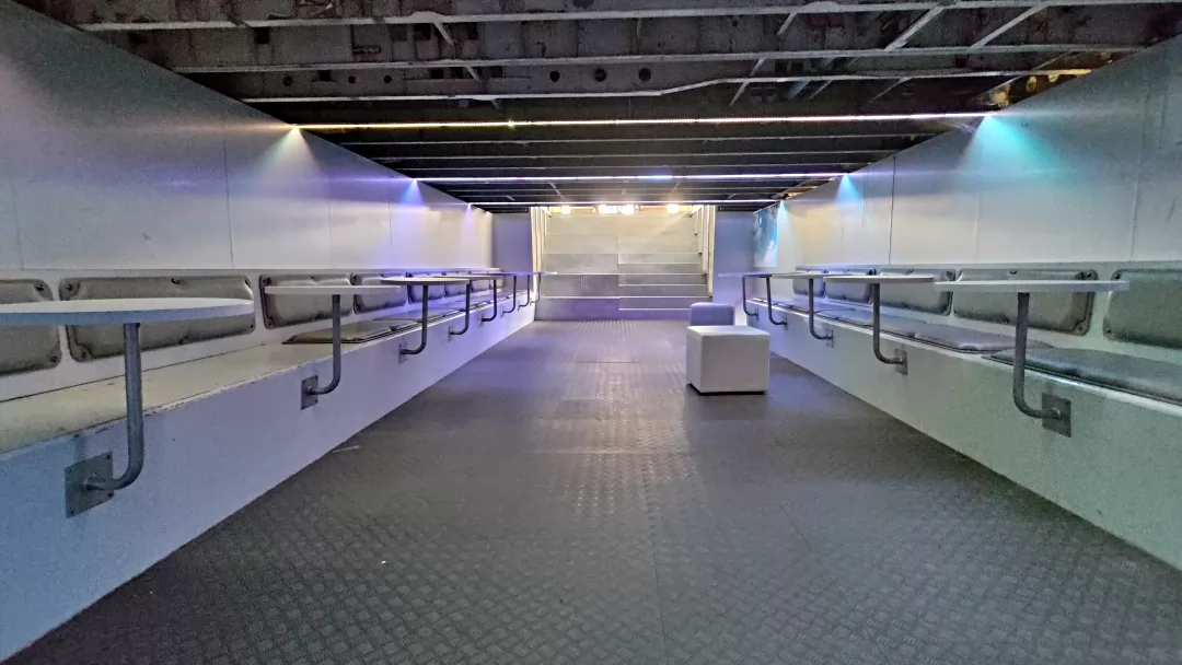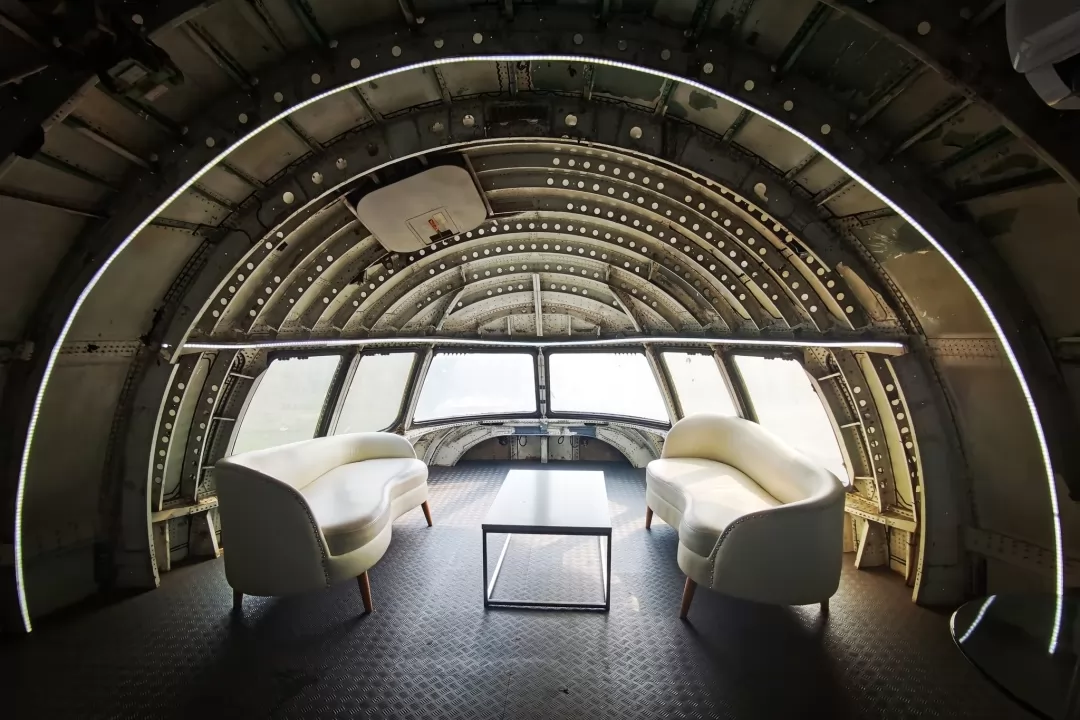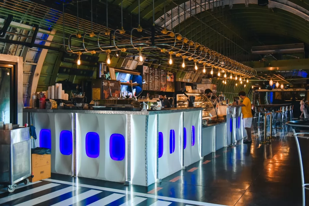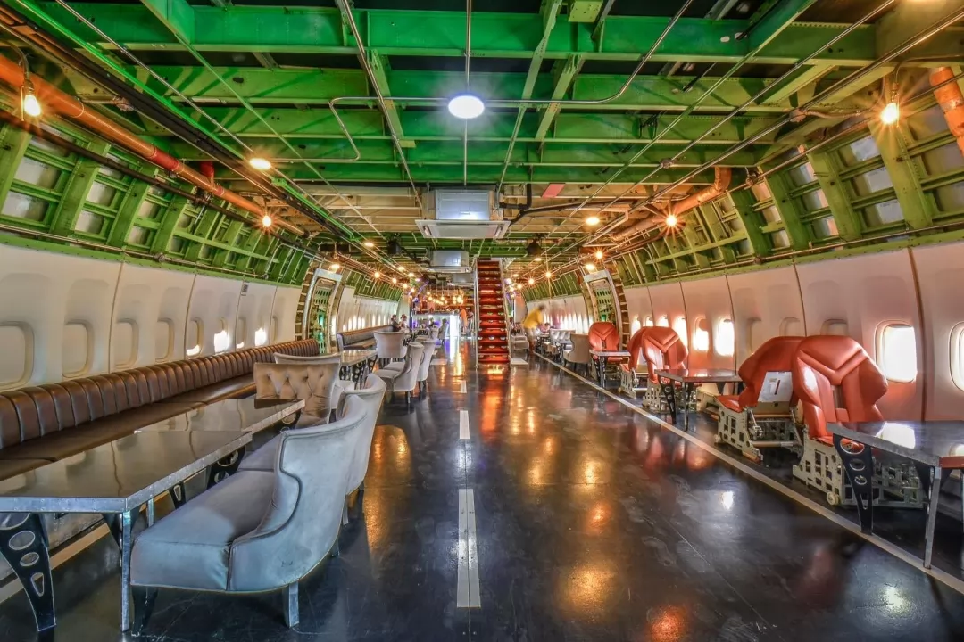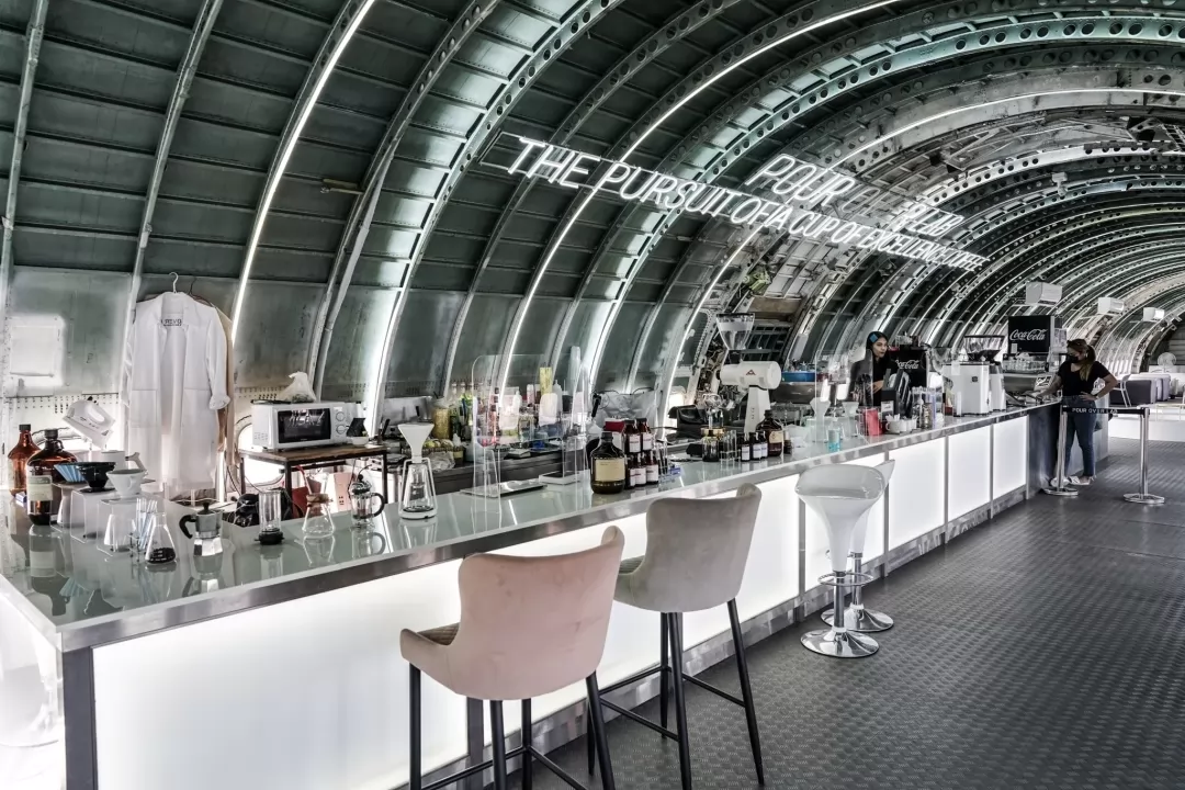 機艙內的設計前衛,時尚又很有科技感,保留機艙原始的鐵皮銀色,再加上燈飾做裝飾,加上具有現代感吧台、白色餐桌椅,簡約中又十分高科感,感覺非常特別現代感强烈,讓前來的客人享受另類的就餐體驗!