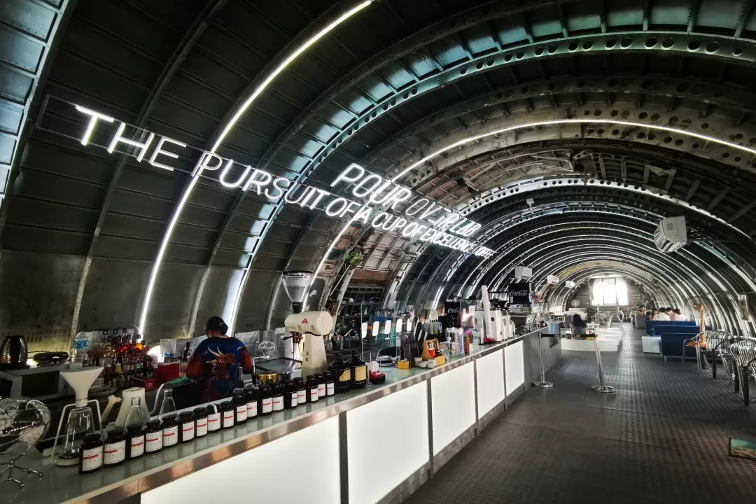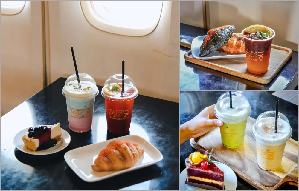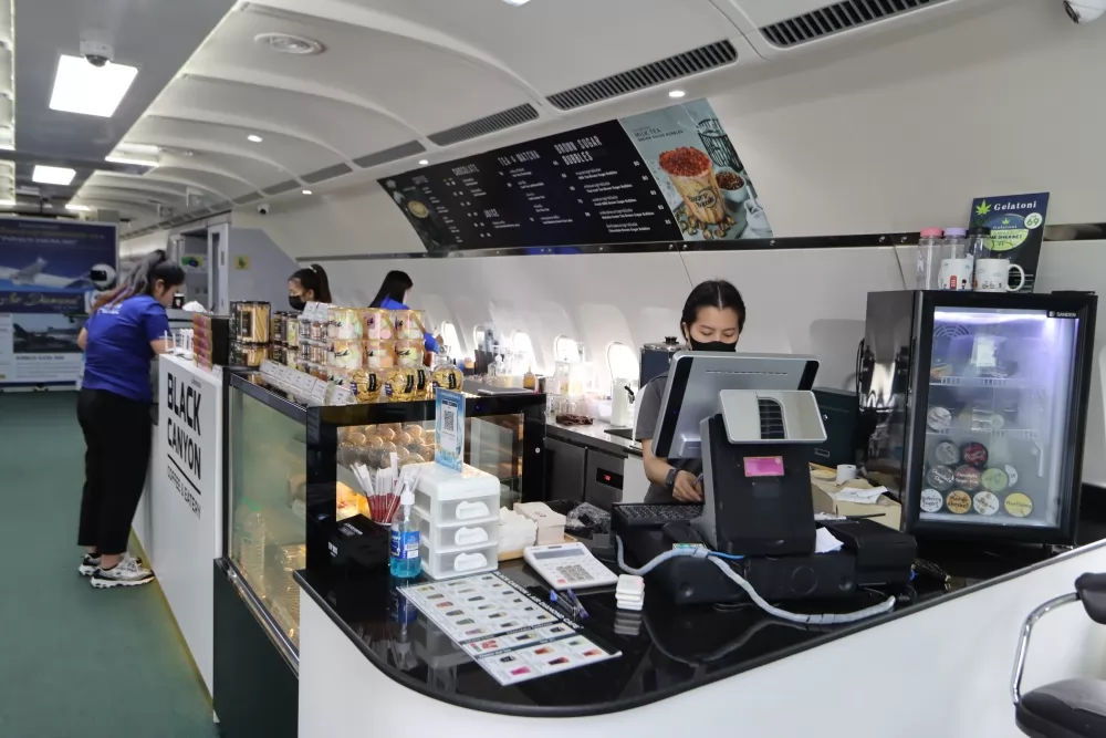 同時引進黑峽谷咖啡Black Canyon(飛機旁邊也有門市店)這家泰國知名的咖啡連鎖店來經營。提供Black Canyon的餐飲,機票可以用來換取咖啡等飲料,至於座位不限區域,有空位都可以坐。顧客還能進入飛機駕駛艙參觀拍照。