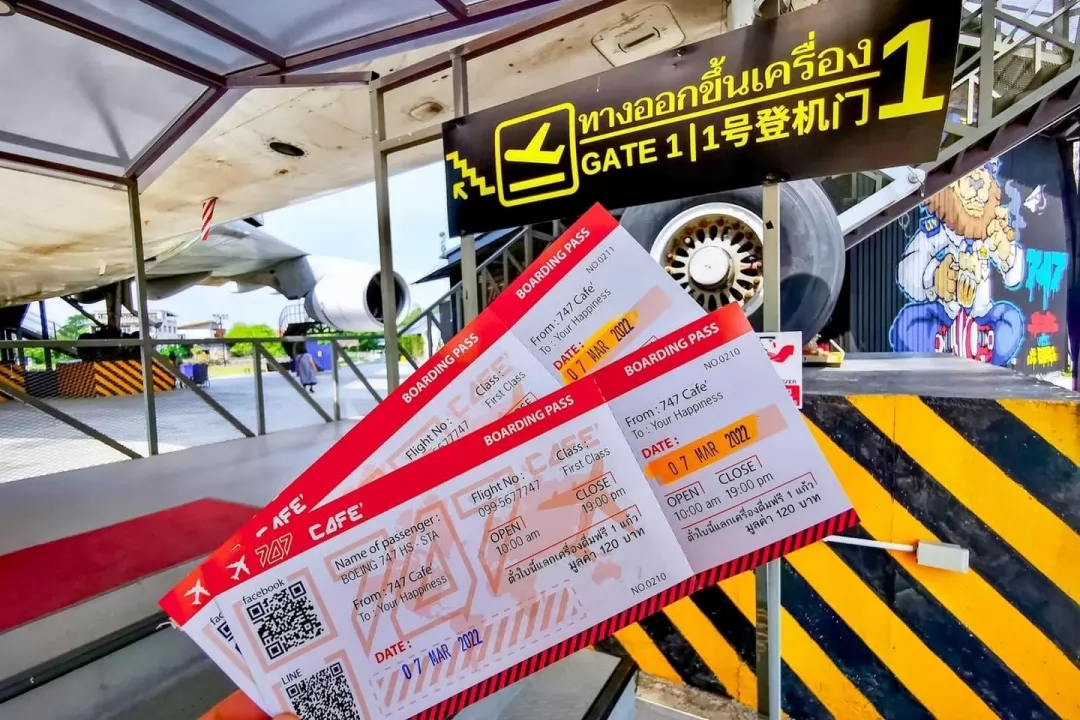 先到售票口,花120銖買張機票(門票),可以折抵咖啡廳裡面的消費,差不多就是1杯飲料及甜點的費用。入口前有班機時刻表,上去直接拉開機艙門入內,飛機有雙層,真的巨大,挑高的空間不會有壓迫感。