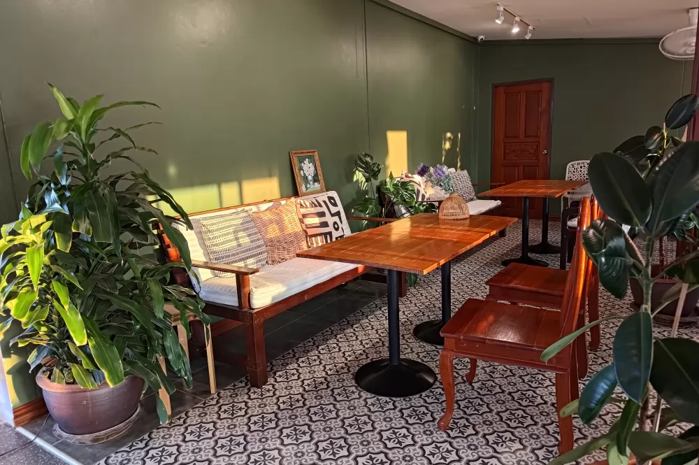 轉角一隅「半露天個人景觀位」,純白瓷磚拼貼點綴桌面,旁邊還擺放著一盆綠色盆栽作點綴,給人非常舒適的感覺!