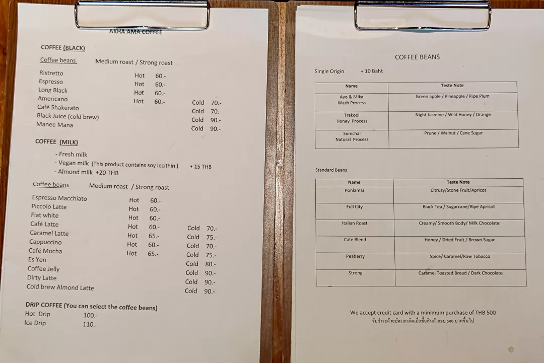 店裡的餐點仍然以飲料為主,不算太複雜,和以前一樣,依種類分成義式咖啡、手沖咖啡和茶飲共三類,義式咖啡則是可以選擇中烘焙( Medium roast)、或是深烘焙( Strong roast) 的豆子。手沖咖啡加價10銖,就能升級選擇單品咖啡豆。