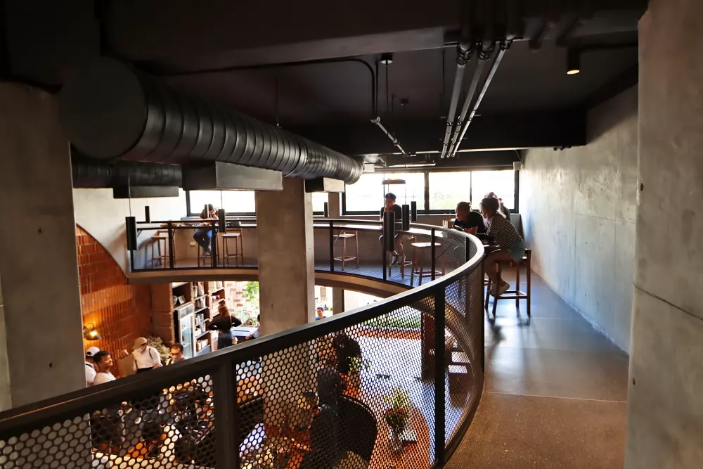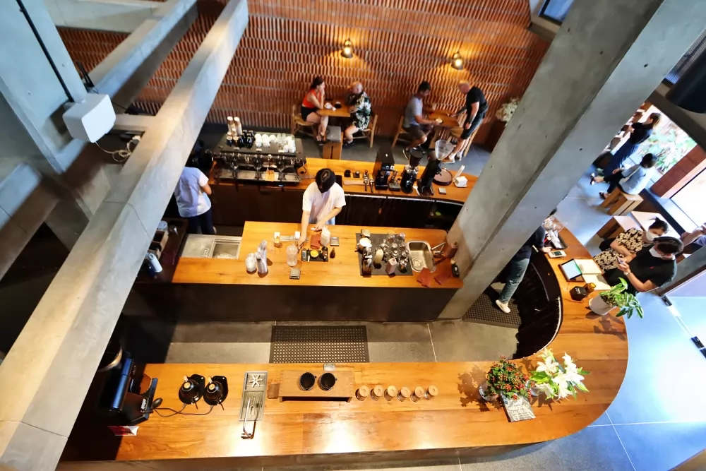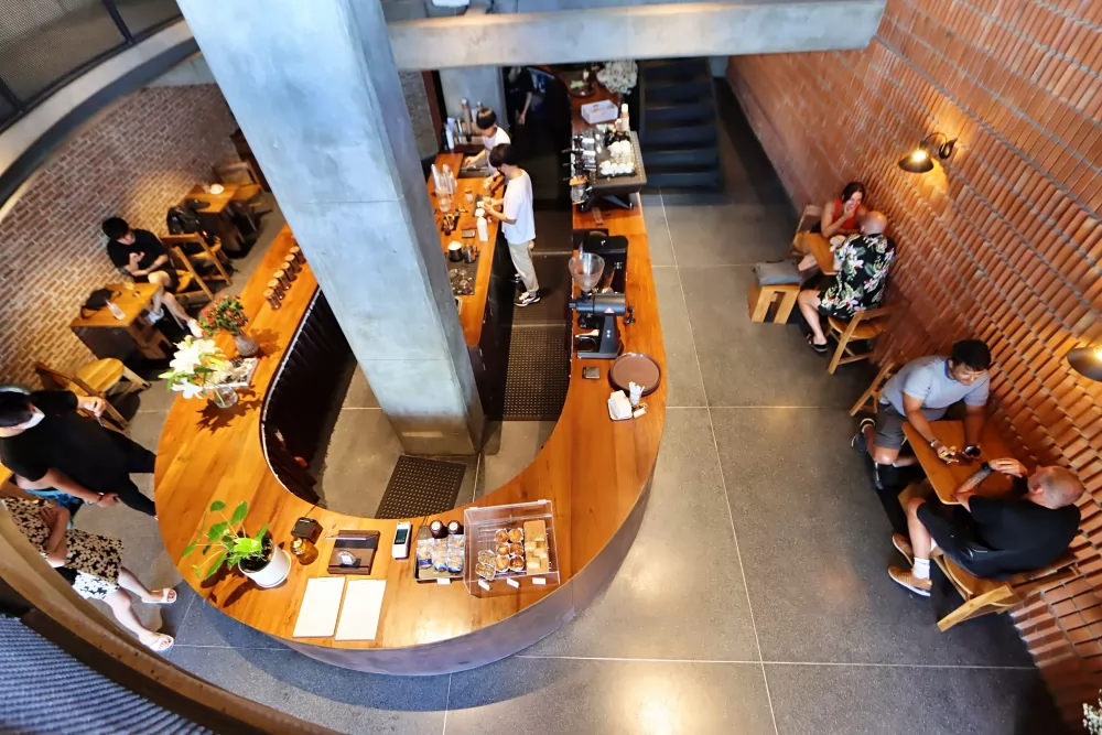 2樓的座位區夠開闊,坐在曲線桌和高腳凳上,低頭就能看樓下的櫃檯。