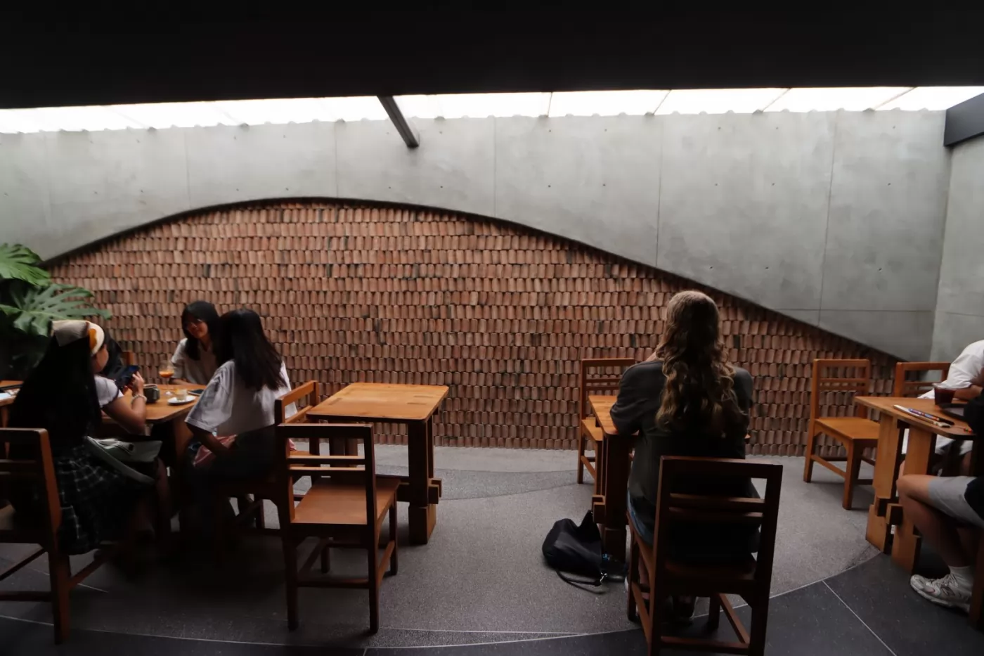 左邊的牆,並非只是平貼紅磚像波浪起伏般,將紅磚一塊塊排列著,打造出幾何圖樣的立體感,很有設計感。